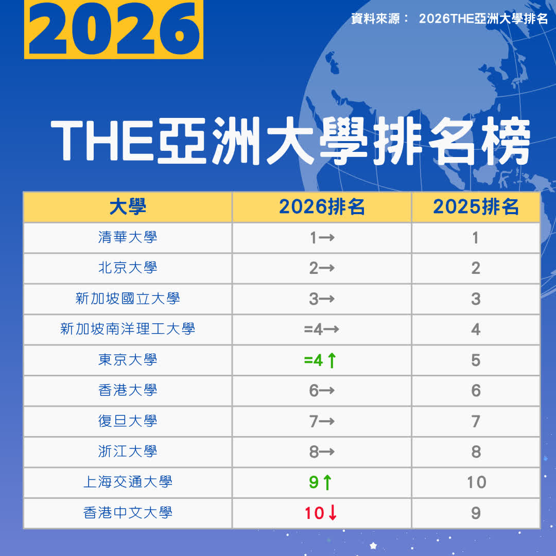 在亞洲前十中,有七所高校來自中國內地及中國香港。內地高校清華大學、北京大學續居第一及第二,其中清華更連續第八年蟬聯榜首;新加坡國立大學緊隨其後位列第三;東京大學則較去年上升一位,與新加坡南洋理工大學並列第四。第六至第十名則由中國內地及中國香港院校包攬,依次為香港大學、復旦大學、浙江大學、上海交通大學及香港中文大學,其中港大、復旦及浙大名次不變,上交大則微升一位至第九名。