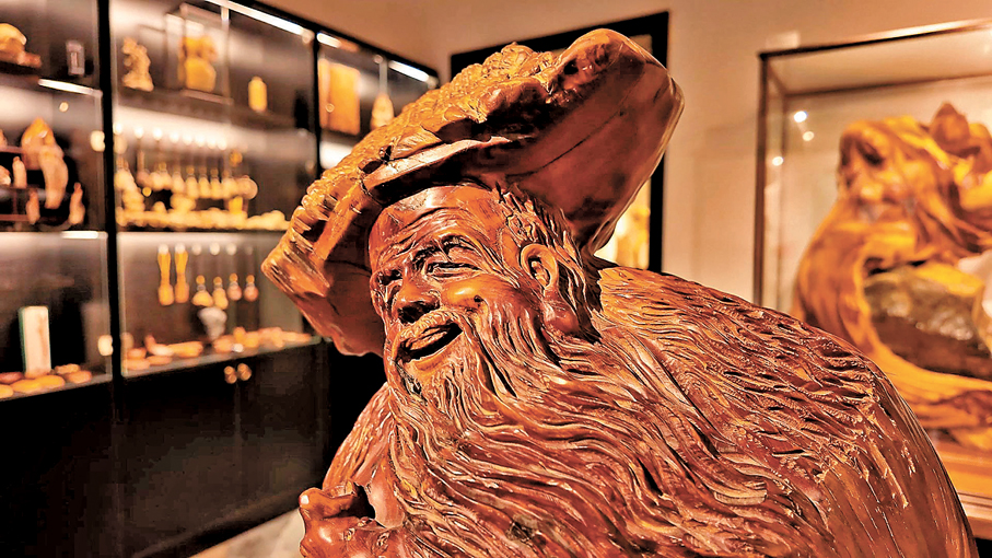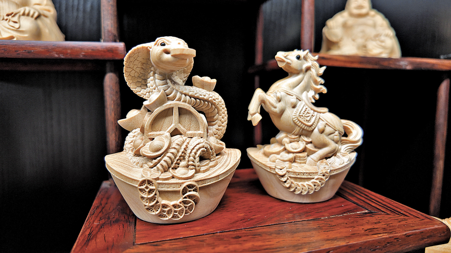走進位於河北石家莊的許紅陽木雕博物館,數百件木雕作品陳列其間。掌間小件玲瓏生動,2米大作仰首方見,虯龍盤曲蒼勁十足,流雲拂袖柔美精緻。工作室內,許紅陽手持刻刀入木,手腕輕旋,生硬的木邊便有了靈動的弧度。他神情專注,呼吸輕緩,指尖沾着的木屑隨動作輕輕灑落,掌心因常年握刀結下的厚繭格外清晰。