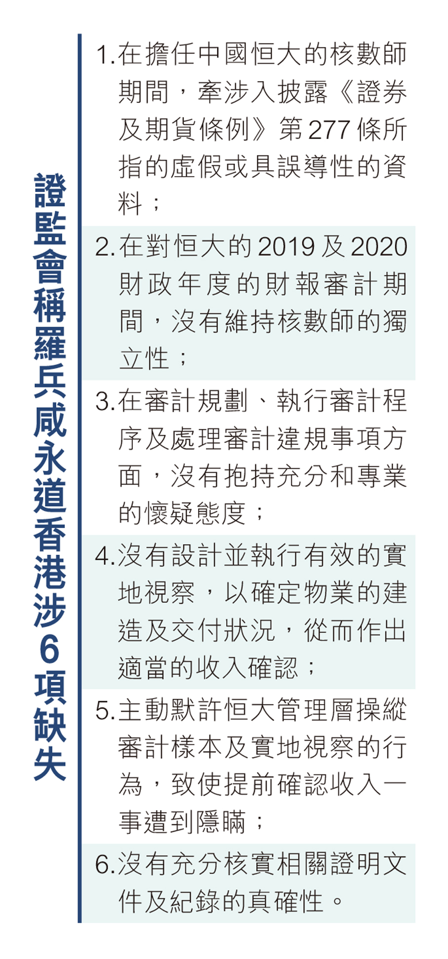 儘管羅兵咸永道香港在事件中不承認任何法律責任,但證監會認為羅兵咸永道香港作為核數師角色,涉及6項缺失(詳見附表)。