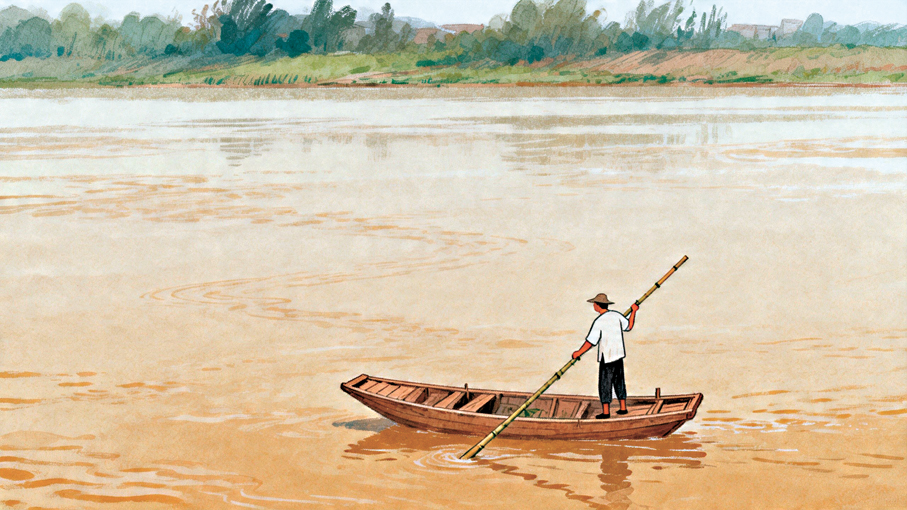 我們那邊叫撐渡,不叫渡船——這個名字起得好,「撐」字裏既有動作也有聲音。撐船的是本村人,個子高大,說話少,笑起來憨憨的。每次撐船之前都會說一聲:「坐好。」他手中的竹篙大約有三四米長,被河水浸得發亮。他撐船的時候,只把竹篙往河底一插,身子稍微向後一仰,船就聽話地離了岸。換手一撐,船頭就徑直對準了對岸。那姿態,並不是用很大的力,而是一種和水商量後的狀態。