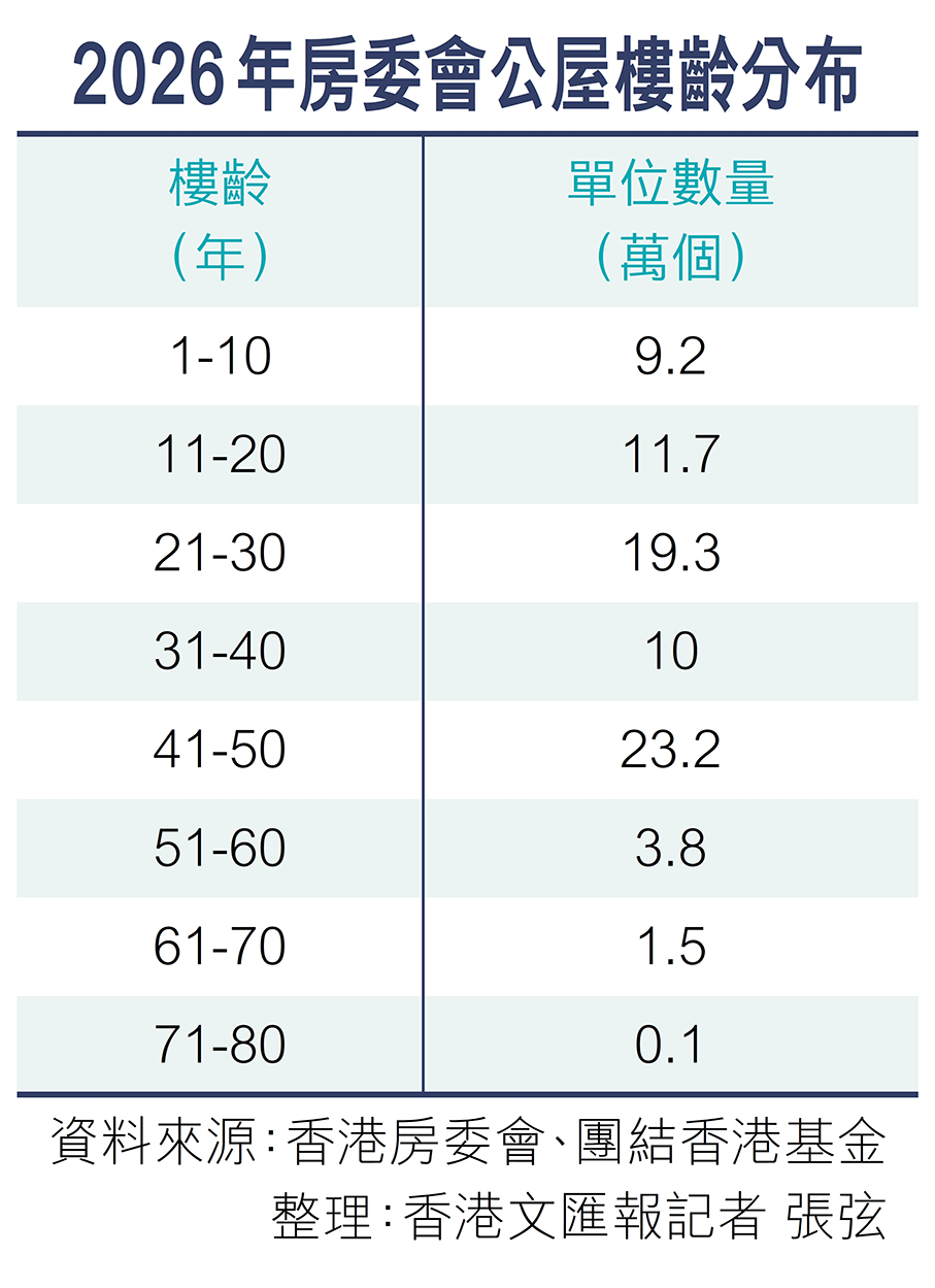 特區政府正全速編制香港首份五年規劃,當中住屋是重點議題之一。目前,香港有不少樓齡偏高的公共屋邨,團結香港基金昨日發表《香港房屋趨勢導航2026》報告,就公營房屋問題建言,預計未來10年,房屋委員會轄下將有超過23萬個公屋單位達50年樓齡,每個單位的平均維修及改善工程開支將持續上升,故提出三大建議,包括政府系統性推動高齡屋邨重建,當中以禾輋邨、大興邨、麗瑤邨及瀝源邨有較高重建價值;提議每年將10%至15%的公營房屋落成量,預留作安置受重建影響的公屋居民;並在合適項目增加重建後的資助出售房屋比例,將建屋淨支出大幅降低78%。