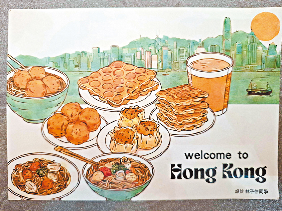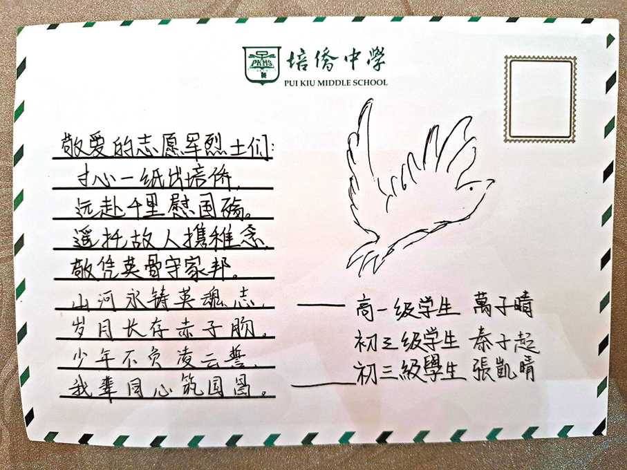 這封由培僑學子精心設計、滿載培僑心願的明信片正面繪滿香港元素,尤以香港美食最為醒目——雞蛋仔、奶茶、粉麵等。背面,此行三位同學萬子晴、秦子超、張凱晴的名字就落筆在右下角。給志願軍烈士們的一段小詩,他們用簡體字一筆一畫地寫在一側,「寸心一紙出培僑,遠赴千里慰國殤……」
