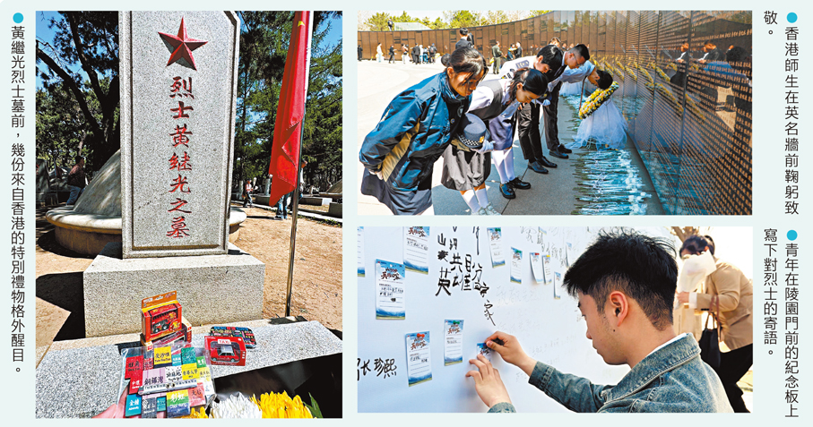 來自香港培僑中學的3位少年用特殊的方式表達紀念。「我帶來的霓虹燈牌、香港的士,都代表着香港生活裏最常見的場景,是香港的煙火氣。」香港培僑中學初三級秦子超與同行的培僑學子站在翠柏環繞的烈士墓碑前娓娓道來,「英雄們用犧牲為我們帶來的正是現在和平、有煙火氣的香港。」他們希望,用來自香江的這份璀璨告慰英靈。