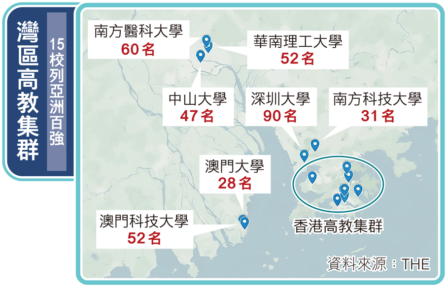 粵港澳大灣區深化協作,是促進優勢互補、拓展規模與影響力的關鍵,在高等教育層面,香港憑藉卓越水平彰顯輻射效應,帶動整個灣區的教育與人才協同發展。香港文匯報記者分析最新的THE亞洲大學排名,除了港校外,包括澳門和深圳、廣州等灣區其他城市亦同樣表現出色,連同香港八大在內,灣區有多達15所大學位列亞洲百強,正逐步形成更重要的高等教育集群,成為整個區域提質升級的重要動力。