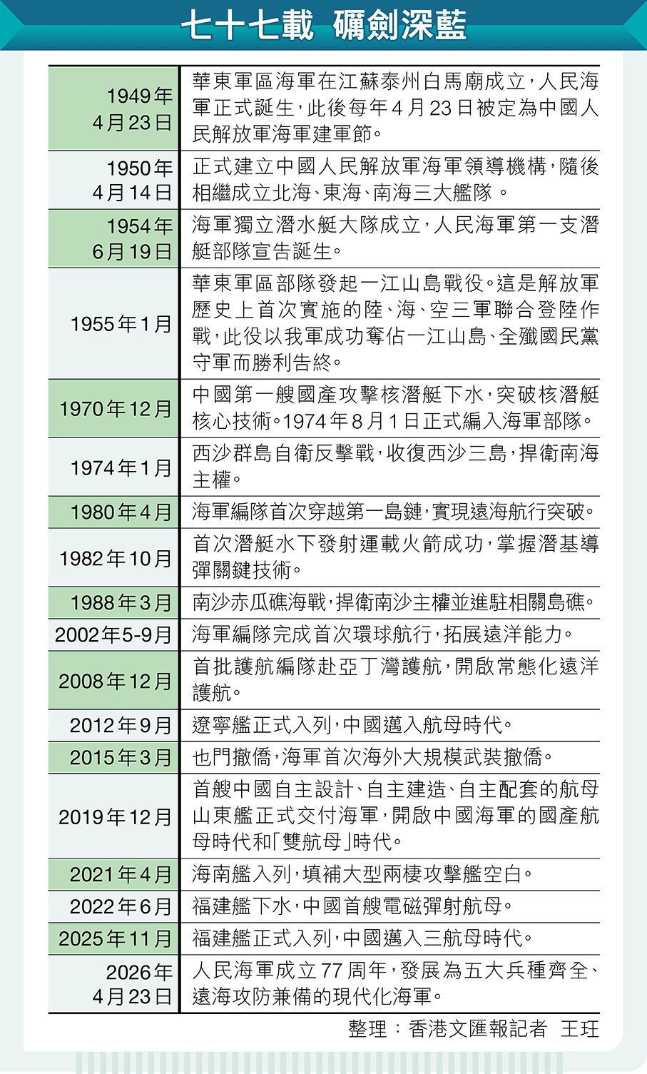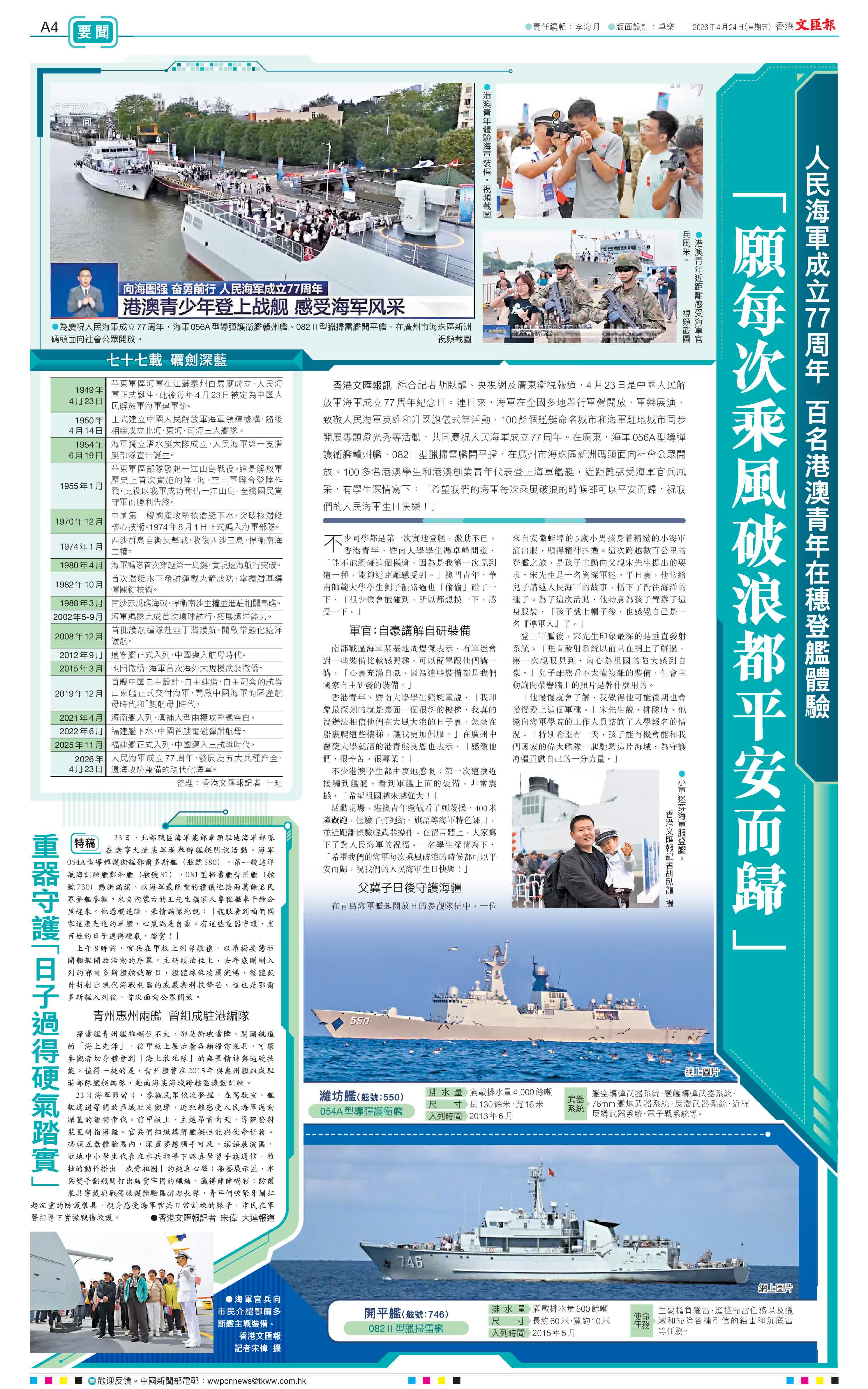 香港文匯報訊 綜合記者胡臥龍、央視網及廣東衛視報道,4月23日是中國人民解放軍海軍成立77周年紀念日。連日來,海軍在全國多地舉行軍營開放、軍樂展演、致敬人民海軍英雄和升國旗儀式等活動,100餘個艦艇命名城市和海軍駐地城市同步開展專題燈光秀等活動,共同慶祝人民海軍成立77周年。在廣東,海軍056A型導彈護衛艦贛州艦、082Ⅱ型獵掃雷艦開平艦,在廣州市海珠區新洲碼頭面向社會公眾開放。100多名港澳學生和港澳創業青年代表登上海軍艦艇,近距離感受海軍官兵風采,有學生深情寫下:「希望我們的海軍每次乘風破浪的時候都可以平安而歸,祝我們的人民海軍生日快樂!」