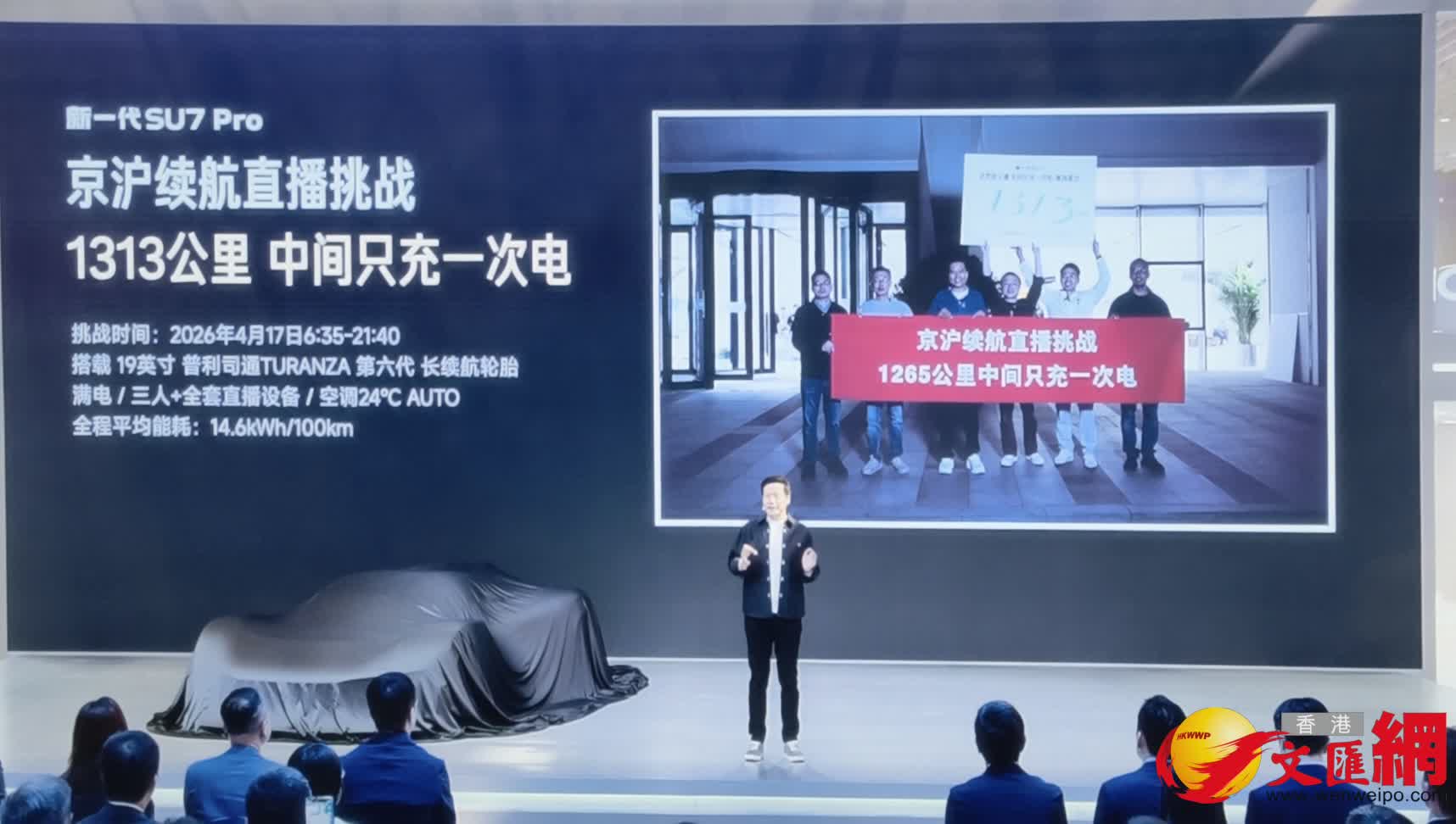 (香港文匯網記者 朱燁 郭瀚林)24日,雷軍在2026北京國際汽車展覽會上透露,在2026年4月17日6:35-21:40,新一代SU7 Pro京滬續航直播挑戰1313公里中間只充一次電。搭載 19英寸普利司通TURANZA 第六代長續航輪胎,滿電/三人+全套直播設備/空調24°C AUTO。全程平均能耗:14.6KWh/100km。