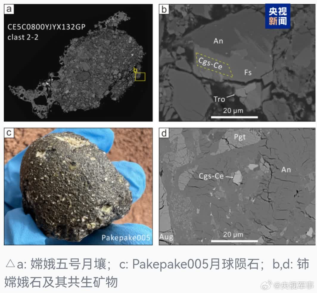 據介紹,鎂嫦娥石、鈰嫦娥石均屬於稀土磷酸鹽礦物,隱匿於月壤微塵之中,粒徑僅數微米,晶體結構精妙獨特,在地球上沒有完全相同的對應礦物。它們與此前發現的嫦娥石同屬於隕磷鈣鈉石族,該類礦物是月球、火星及小行星樣品中常見的磷酸鹽礦物,但在不同類地天體中表現出成分的多樣性和分布的不均一性。