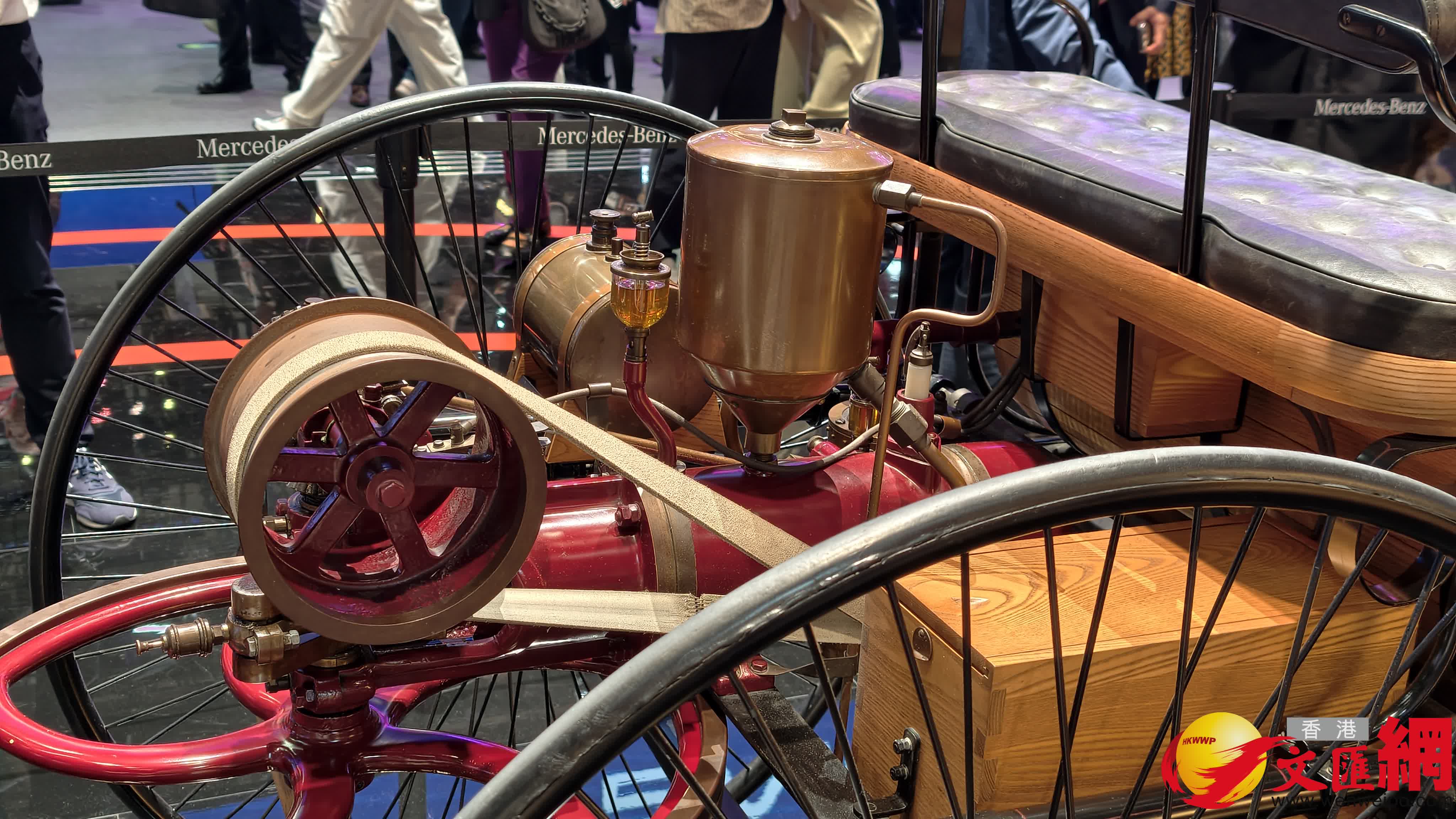 (香港文匯網記者朱燁 郭瀚林 北京報道)在今年的北京車展上,記者在奔馳展台看到一架「三輪車」,這是1886年的奔馳專利機動車(Benz Patent-Motorwagen),其被公認為「第一輛汽車」,從技術史和商業史的角度看,都是當之無愧的「第一」。這輛「三輪車」,標誌着人類正式進入了汽車時代。