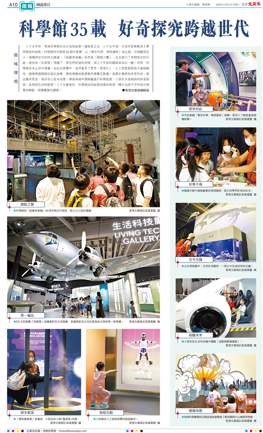 三十五年前,香港科學館在尖沙咀亮起第一道探索之光;三十五年後,它依然是無數孩子夢想啟航的起點。科學館特別舉辦35周年展覽,以「樂在科學·無限趣味」為主題,引領觀眾走入一條橫跨世代的時光隧道。「能量穿梭機」依然是「鎮館之寶」,並且進行了其間限定的升級。銀色的「貝茜號」飛機下,學生們仰望的神情,與三十年前的觀展者如出一轍。然而,科學館並未止步於懷舊。在紀念展覽中,我們看見了更多「新面孔」:人工智能教授孩子瑜伽動作、龍捲風模擬器在指尖旋轉、還有模擬地殼變動的漫畫互動牆。從歷史實錄到未來科技,展品雖有更迭,惟好奇心從未改變。導賞員藉中國陶藝進行科學啟蒙;小孩在水族箱前的俯首凝視,表現對生命的敬畏。三十五載春秋,科學館始終能將深奧的真理,轉化為孩子手中那次興奮的轉動、那聲驚喜的讚嘆。 ●香港文匯報編輯組