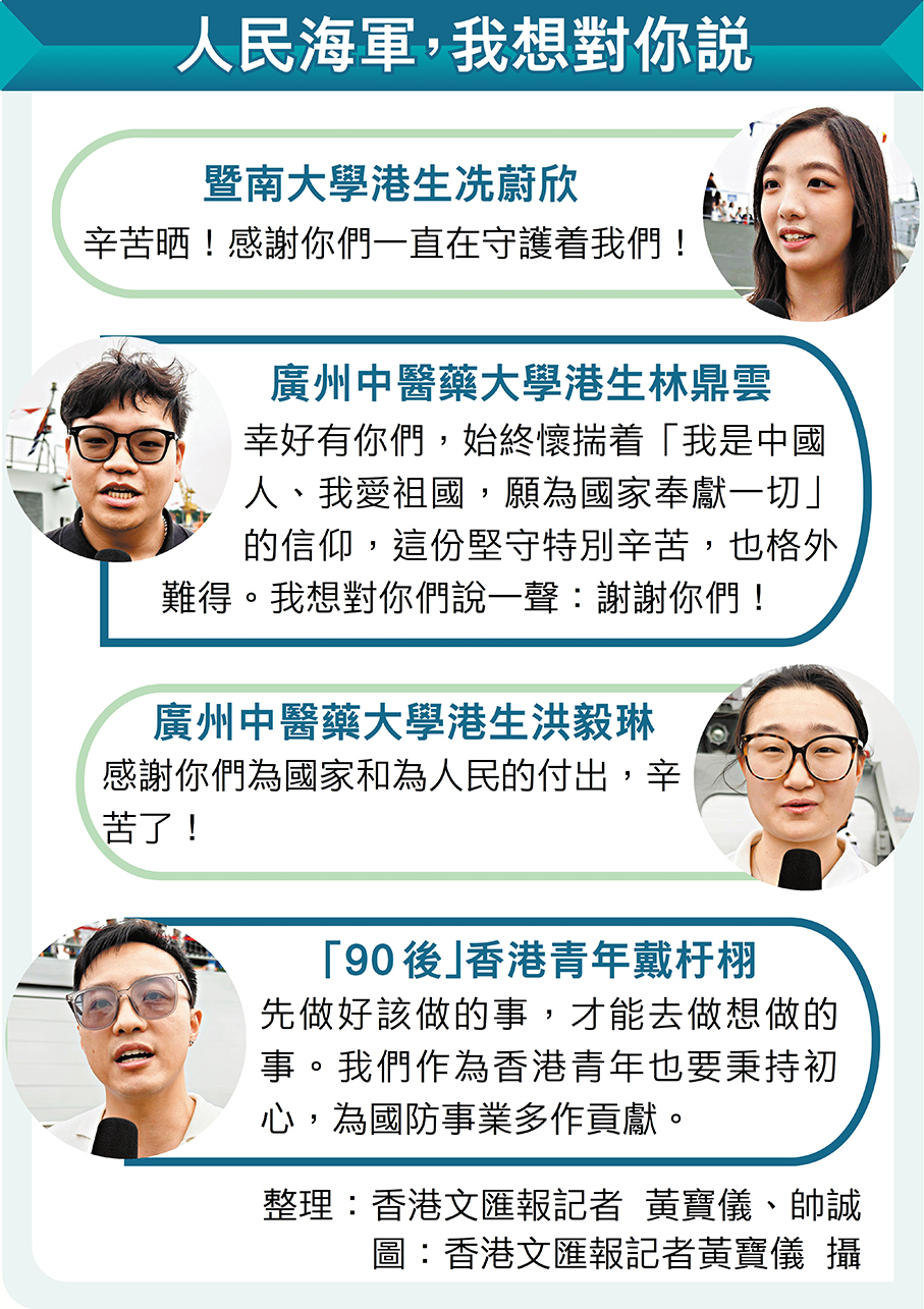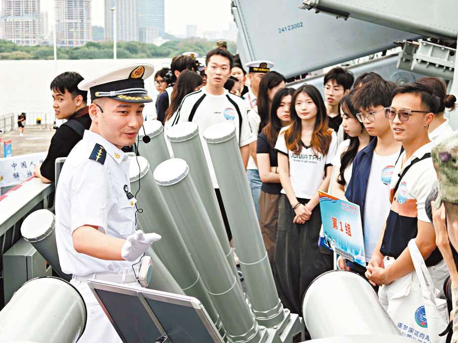 就讀於廣州中醫藥大學的「00後」港生林鼎雲,在港求學期間對中國近代史了解甚少。來到內地就讀大學後,通過遊歷祖國大好河山、學習歷史知識不斷增長見聞。他感慨道:「今天我站在軍艦甲板上,親眼見到各類先進裝備,真切感受到我國國防實力實現了翻天覆地的提升。」從林鼎雲激動動容的話語中,能夠深切體會到他發自內心的民族自豪感與愛國熱忱。