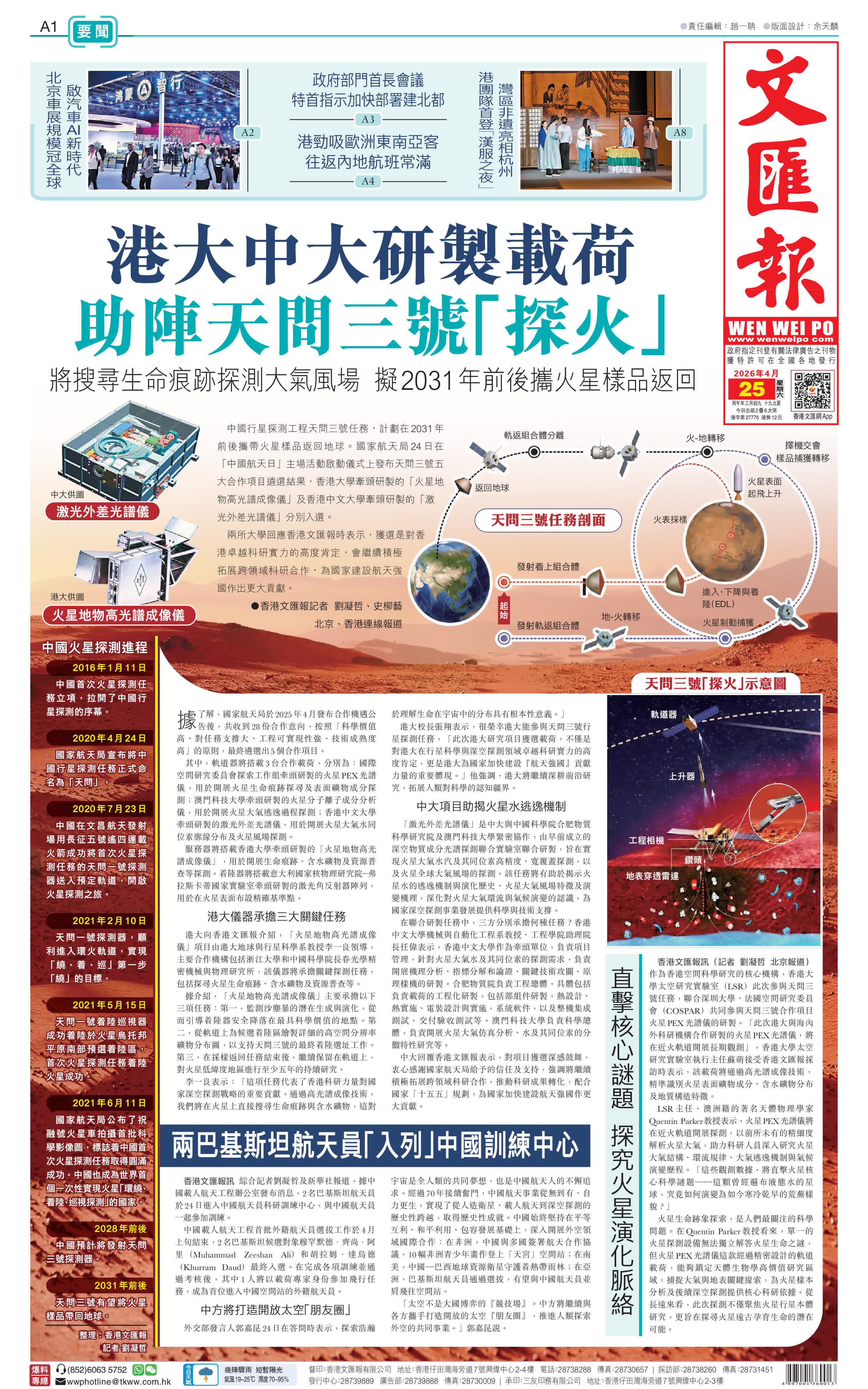 港大校長張翔表示,很榮幸港大能參與天問三號行星探測任務,「此次港大研究項目獲選載荷,不僅是對港大在行星科學與深空探測領域卓越科研實力的高度肯定,更是港大為國家加快建設『航天強國』貢獻力量的重要體現。」他強調,港大將繼續深耕前沿研究,拓展人類對科學的認知疆界。