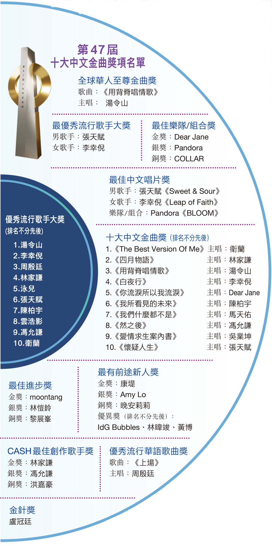 有別於以往模式,香港電台於上月開始陸續頒發部分獎項。至於「CASH最佳創作歌手獎」、「最佳中文唱片獎」、「全球華人至尊金曲獎」及「最優秀流行男/女歌手大獎」則於昨日揭曉。憑《愛情求生案內書》得到十大中文金曲獎的吳業坤,在台上演繹時承認將離開唱片公司,稱他是最後一次以TMG(TVB Music Group)歌手身份出席頒獎禮。得獎後,吳業坤接受訪問時表示,他目前仍與邵氏及無綫有合約,但與TMG的合約已屆滿,並決定不再續約,打算以自資形式推出新歌。被問到是否有其他公司向他招手,他坦言暫時沒有,亦未有與其他唱片公司接觸,很想任性一次,否則再不行動就會太遲。他透露現時已收到一些Demo,但會非常謹慎挑選,確保精準後才會推出第一首歌。衛蘭(Janice)剛度過44歲生日,她表示得獎是最好的生日禮物之一,但更令她開心的是能與許久未見的歌手相聚。近期主力在內地巡演的Janice,計劃於年底在香港紅館舉行巡演尾站,並打算邀請前老闆黎明擔任嘉賓。