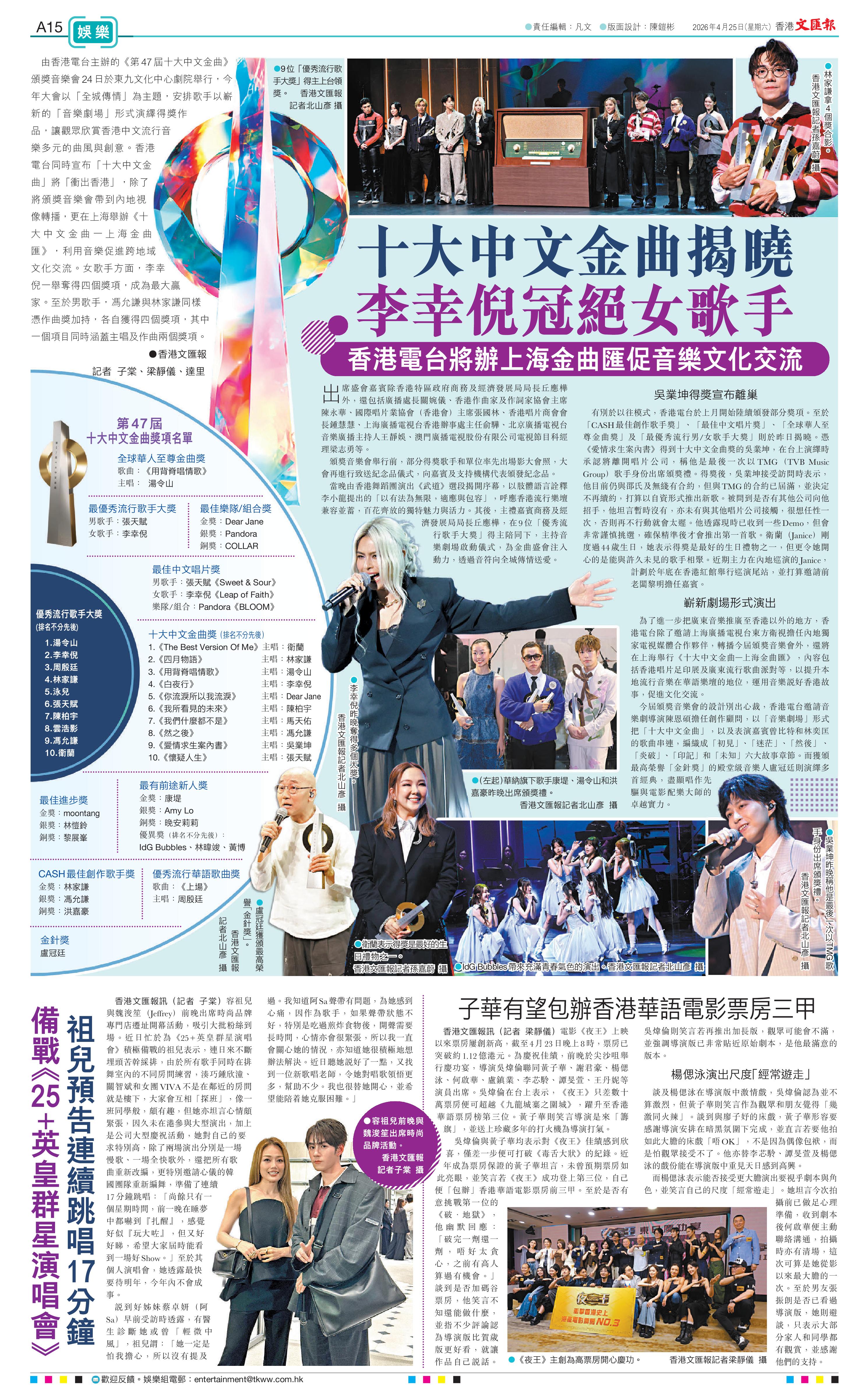香港文匯報訊(記者 子棠、梁靜儀、達里)由香港電台主辦的《第47屆十大中文金曲》頒獎音樂會24日於東九文化中心劇院舉行,今年大會以「全城傳情」為主題,安排歌手以嶄新的「音樂劇場」形式演繹得獎作品,讓觀眾欣賞香港中文流行音樂多元的曲風與創意。香港電台同時宣布「十大中文金曲」將「衝出香港」,除了將頒獎音樂會帶到內地視像轉播,更在上海舉辦《十大中文金曲一上海金曲匯》,利用音樂促進跨地域文化交流。女歌手方面,李幸倪一舉奪得四個獎項,成為最大贏家。至於男歌手,馮允謙與林家謙同樣憑作曲獎加持,各自獲得四個獎項,其中一個項目同時涵蓋主唱及作曲兩個獎項。