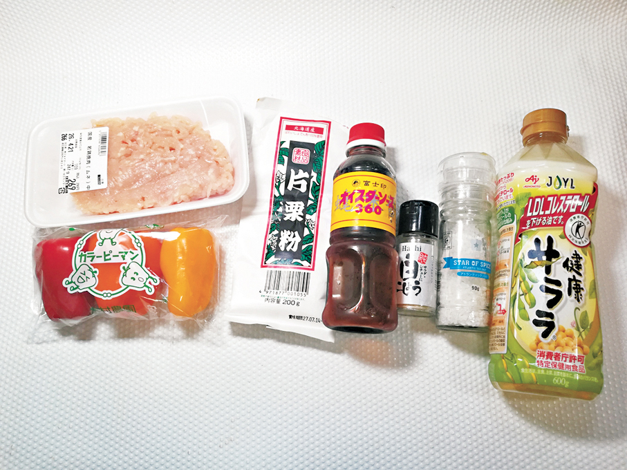 免治雞肉300克、彩椒3隻、片栗粉2茶匙、鹽少許、胡椒粉少許、油1湯匙、蠔油2湯匙
