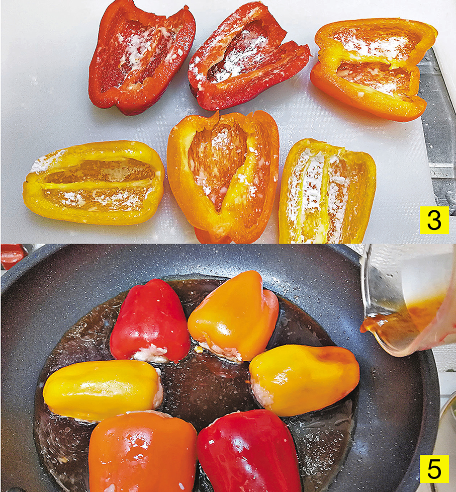 5. 燒熱鑊、下油,將釀妥的彩椒放入鑊內,中火煎約2分鐘,加入煮汁,蓋上鑊蓋,燜燒約3分鐘至汁液濃稠、釀饀熟透即成。