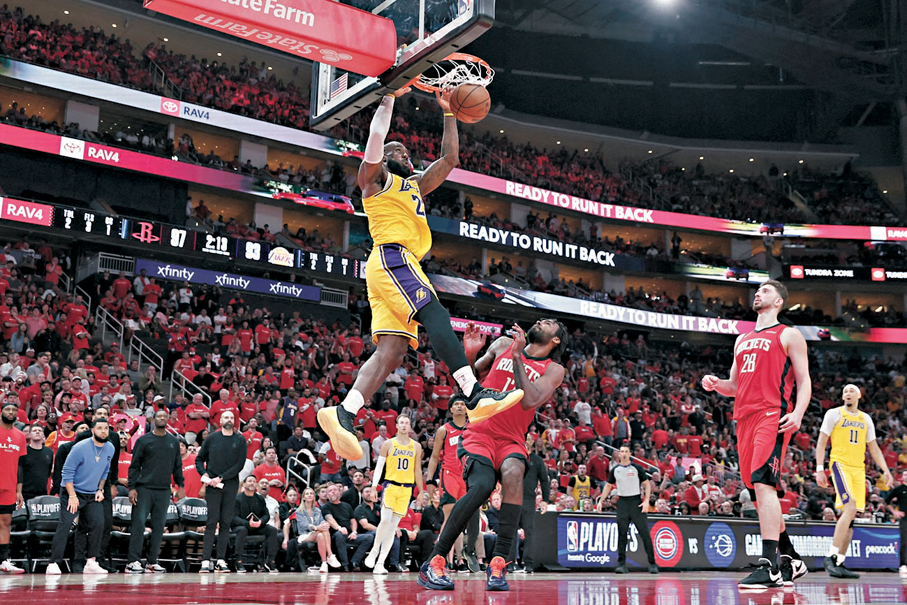 香港文匯報訊(記者 葉詩敏)湖人與火箭在周六(25日)NBA季後賽首輪第三戰狹路相逢,湖人靠老將勒邦占士貢獻29分兼撐起全隊進攻,最終作客加時以112:108力挫對手,在系列賽中取得3:0的絕對領先。