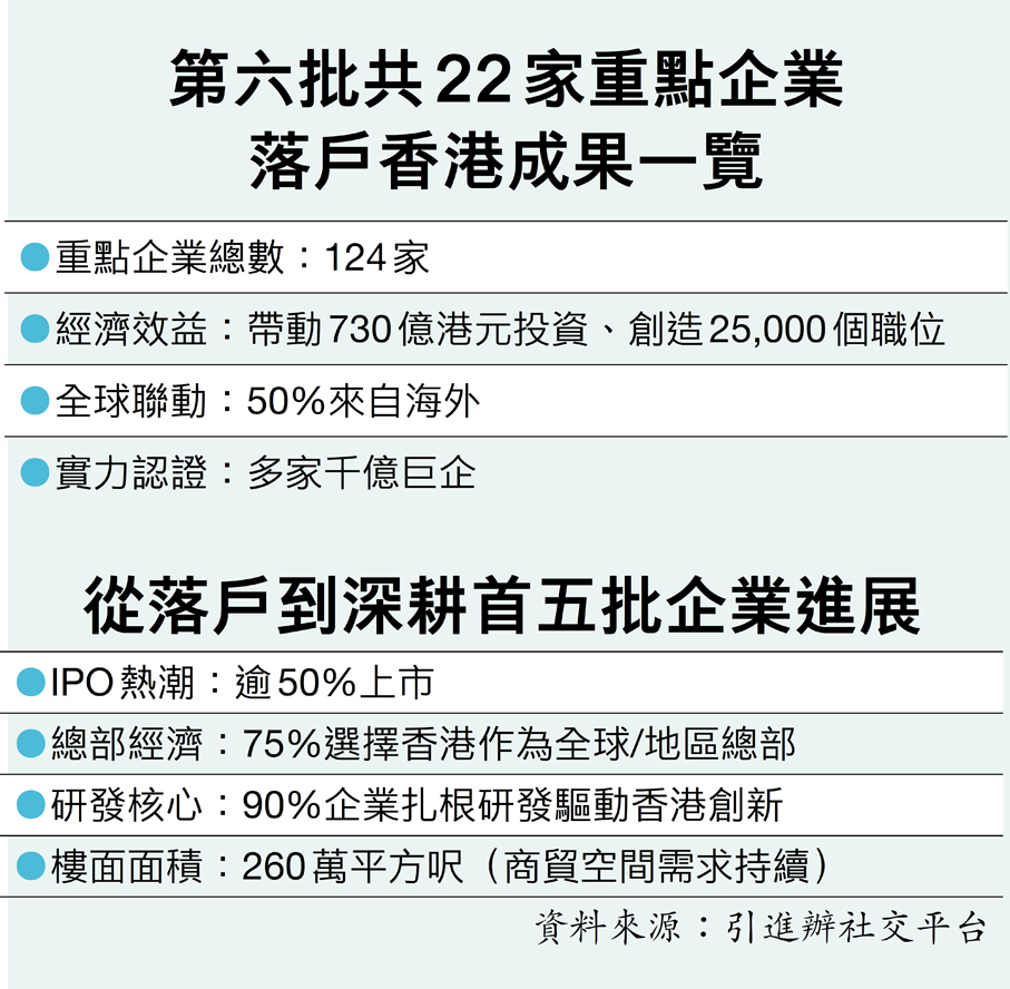在首四批重點企業中,約七成來自內地,第五批海外企業比例增至四成,第六批升至一半。任景信重申「重質不重量」,預期海外企業升勢會持續,認為是政府過去大力出訪的成果。透過「說好香港的故事」,令海外企業更明白香港的優勢,而地緣政治的變化,也使企業覺得在風險管控上,需要尋找更多地方去分散風險。