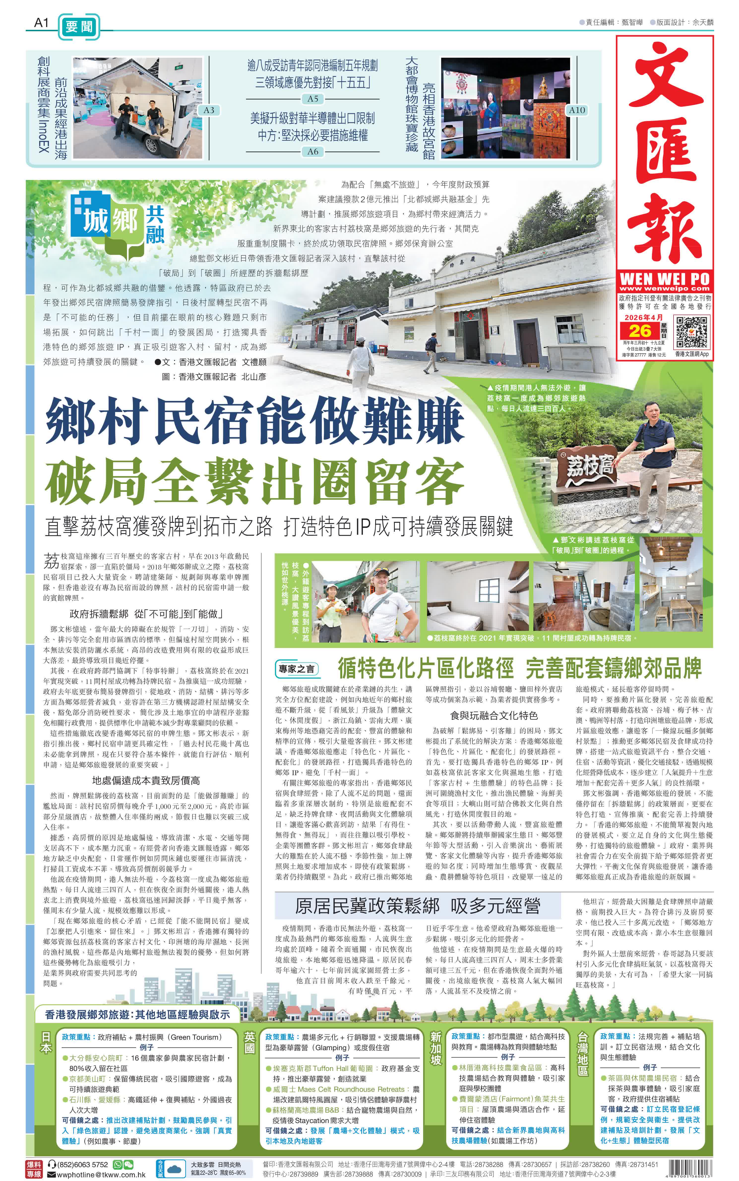 (香港文匯報記者 文禮願)為配合「無處不旅遊」,今年度財政預算案建議撥款2億元推出「北都城鄉共融基金」先導計劃,推展鄉郊旅遊項目,為鄉村帶來經濟活力。新界東北的客家古村荔枝窩是鄉郊旅遊的先行者,其間克服重重制度關卡,終於成功領取民宿牌照。鄉郊保育辦公室總監鄧文彬近日帶領香港文匯報記者深入該村,直擊該村從「破局」到「破圈」所經歷的拆牆鬆綁歷程,可作為北都城鄉共融的借鑒。他透露,特區政府已於去年發出鄉郊民宿牌照簡易發牌指引,日後村屋轉型民宿不再是「不可能的任務」,但目前擺在眼前的核心難題只剩市場拓展,如何跳出「千村一面」的發展困局,打造獨具香港特色的鄉郊旅遊 IP,真正吸引遊客入村、留村,成為鄉郊旅遊可持續發展的關鍵。