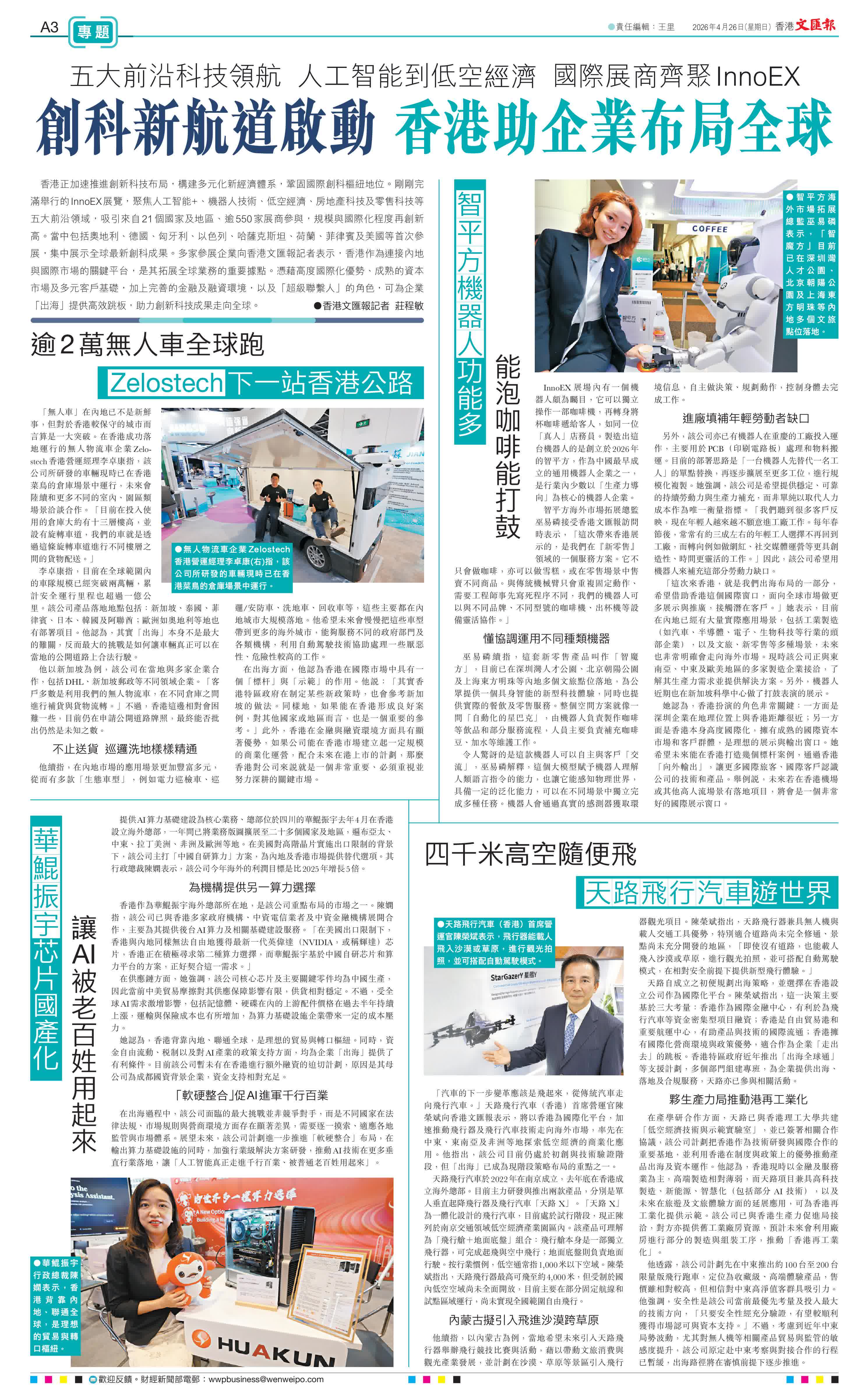 (香港文匯報記者 莊程敏)香港正加速推進創新科技布局,構建多元化新經濟體系,鞏固國際創科樞紐地位。剛剛完滿舉行的InnoEX展覽,聚焦人工智能+、機器人技術、低空經濟、房地產科技及零售科技等五大前沿領域,吸引來自21個國家及地區、逾550家展商參與,規模與國際化程度再創新高。當中包括奧地利、德國、匈牙利、以色列、哈薩克斯坦、荷蘭、菲律賓及美國等首次參展,集中展示全球最新創科成果。多家參展企業向香港文匯報記者表示,香港作為連接內地與國際市場的關鍵平台,是其拓展全球業務的重要據點。憑藉高度國際化優勢、成熟的資本市場及多元客戶基礎,加上完善的金融及融資環境,以及「超級聯繫人」的角色,可為企業「出海」提供高效跳板,助力創新科技成果走向全球。