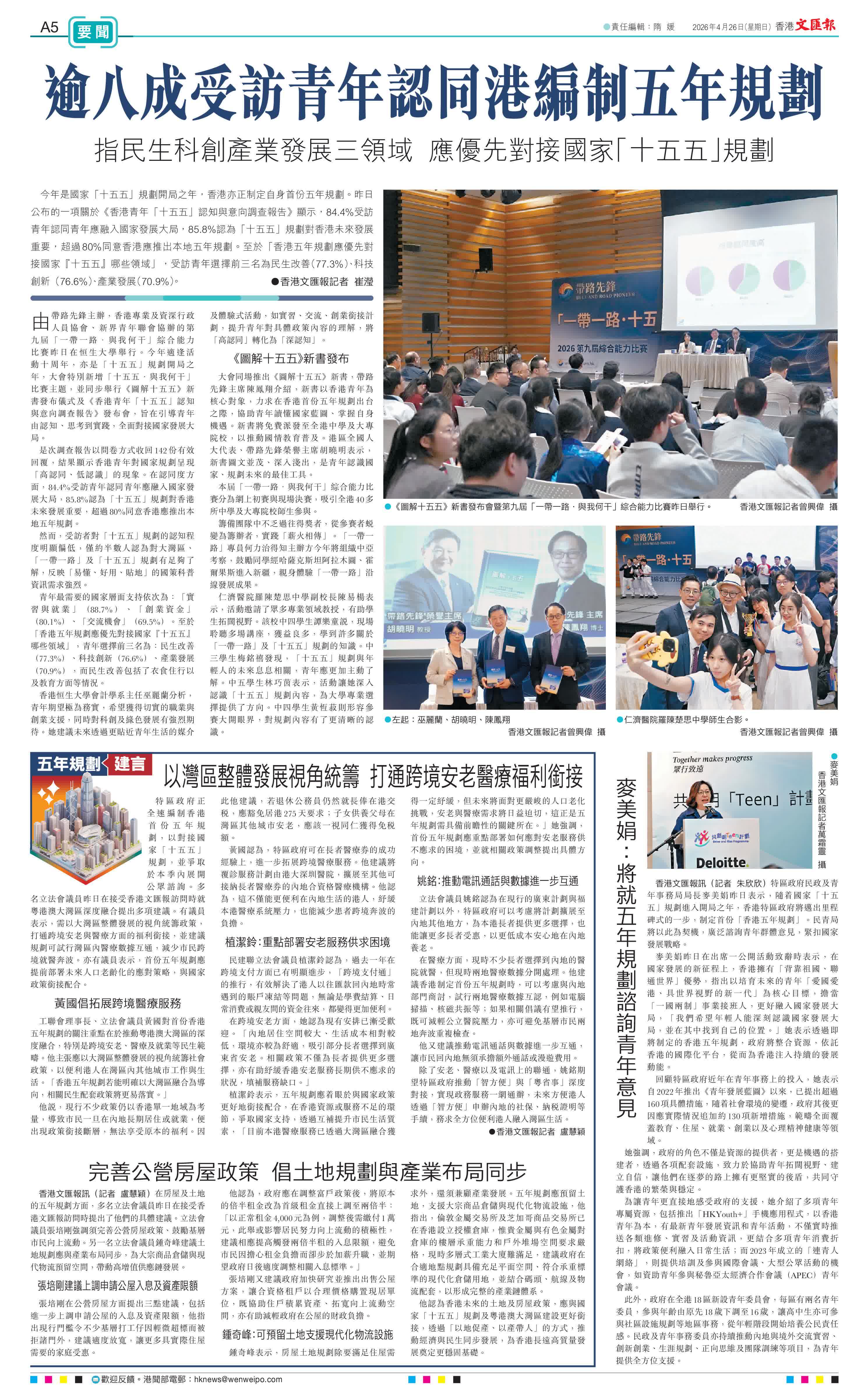 (香港文匯報記者 崔瀅)今年是國家「十五五」規劃開局之年,香港亦正制定自身首份五年規劃。昨日公布的一項關於《香港青年「十五五」認知與意向調查報告》顯示,84.4%受訪青年認同青年應融入國家發展大局,85.8%認為「十五五」規劃對香港未來發展重要,超過80%同意香港應推出本地五年規劃。至於「香港五年規劃應優先對接國家『十五五』哪些領域」,受訪青年選擇前三名為民生改善(77.3%)、科技創新(76.6%)、產業發展(70.9%)。