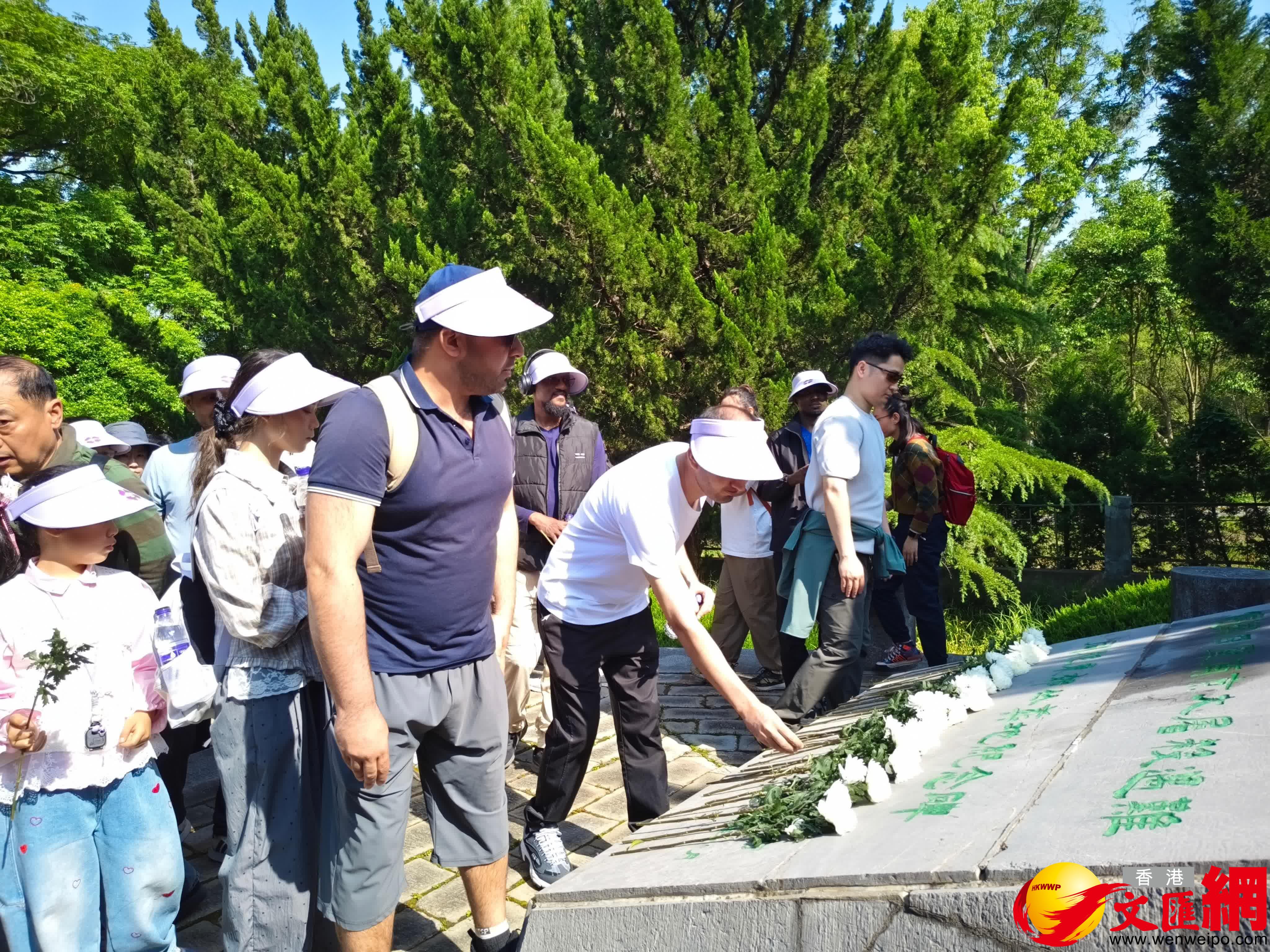 侵華日軍南京大屠殺遇難同胞東郊叢葬地是南京大屠殺17處遇難同胞叢葬地之一,這裏掩埋着1937年12月南京淪陷後,在東郊區域慘遭日軍殺害的3萬多具無辜軍民遺骸。中外人士依次向叢葬地紀念碑敬獻鮮花,並集體默哀1分鐘。現場組織參與者輕聲誦讀《和平宣言》選段,以文字傳遞珍愛和平的信念。