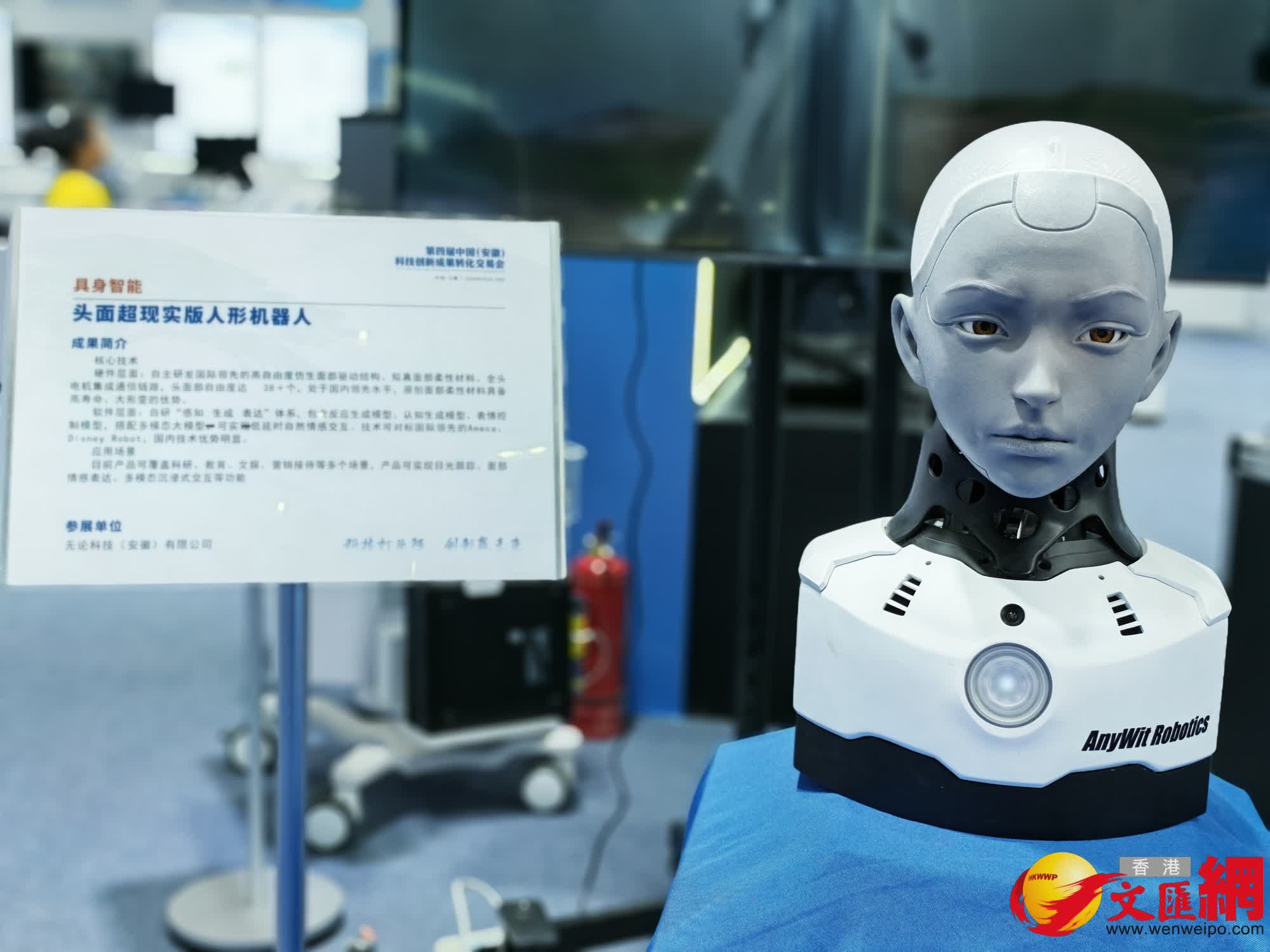 不遠處,一個與人臉相差無幾的頭面機器人格外顯眼。工作人員表示,「這是一款超現實的仿真的人形機器人的頭面部,它的整個頭部超38個活動部件,可以做非常豐富的表情,並且它的眼睛是能夠追隨你的,跟你實現一個實時的互動交流,而且它唱歌也非常好聽,是人機情感交互領域的突破性成果。」
