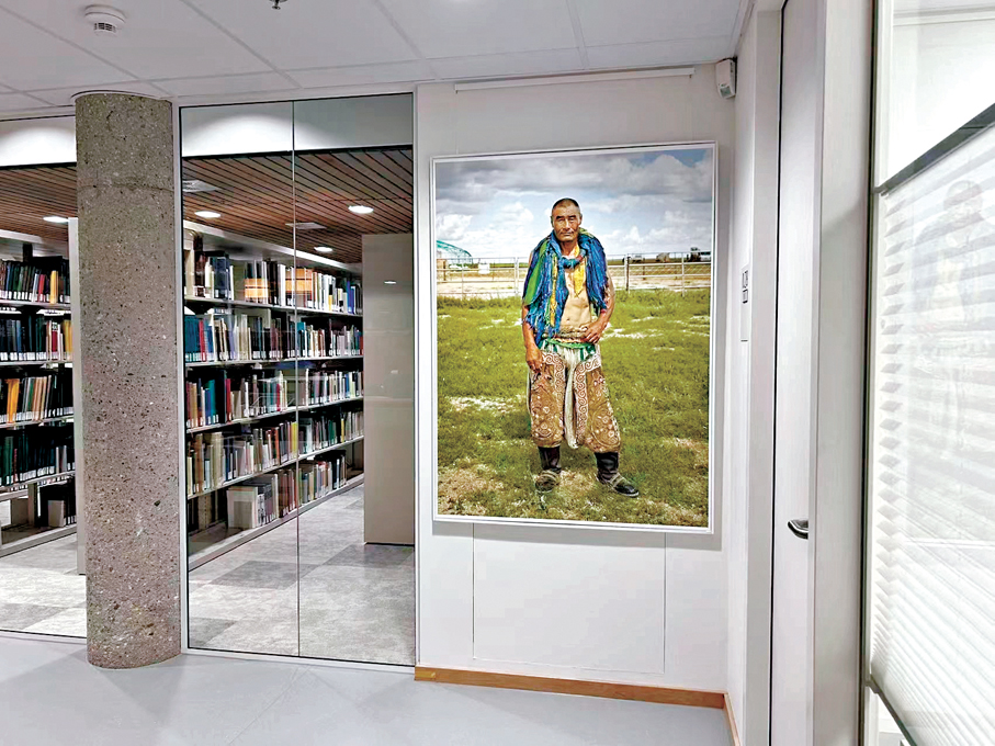 這次不同,展覽被安排在萊頓大學圖書館一樓的IIAS(國際亞洲研究院)。在這裏,有大塊的落地玻璃,從裏面一個抬頭,就看到這些作品環繞着整個辦公區域,就好像它們生來就掛在此處。然後,它就發揮出了與展覽大廳不同的效果。那就是,這些作品當中所蘊含的深厚歷史感通過內蒙古人粗糙的臉龐、身上的民族服裝,以及那草原被傳遞到這所大學,而大學的氛圍又加強了這種厚重的味道。
