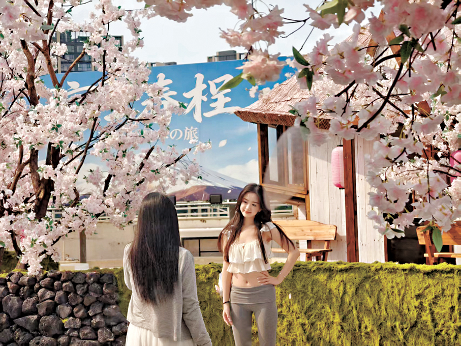 步入深圳龍崗區坂田街道龍景科技園,周遭是典型工業區樣貌,可一旦來到D棟9樓天台,眼前景象瞬間切換—櫻花步道綿延,遠方富士山造景若隱若現,風拂而過,花瓣與光影交織成無需濾鏡的畫面,讓人彷彿置身於日本。這裏是「Blue Concept Cafe&Farm·關於藍」(簡稱「關於藍」),已成為深圳天台審美辨識度極高的打卡地。事實上,深圳的天台經濟已具規模及普及,老闆們各出奇謀,利用廠房或商廈樓頂的空間優勢,將閒置的天台打造成景點、食肆,甚至是運動場。而且,他們不少透過「場景營造」引流,再以餐飲或拍攝等服務留客,形成閉環消費,在滿足大眾沉浸式消費需求的同時,也為舊的建築注入新的商業活力。