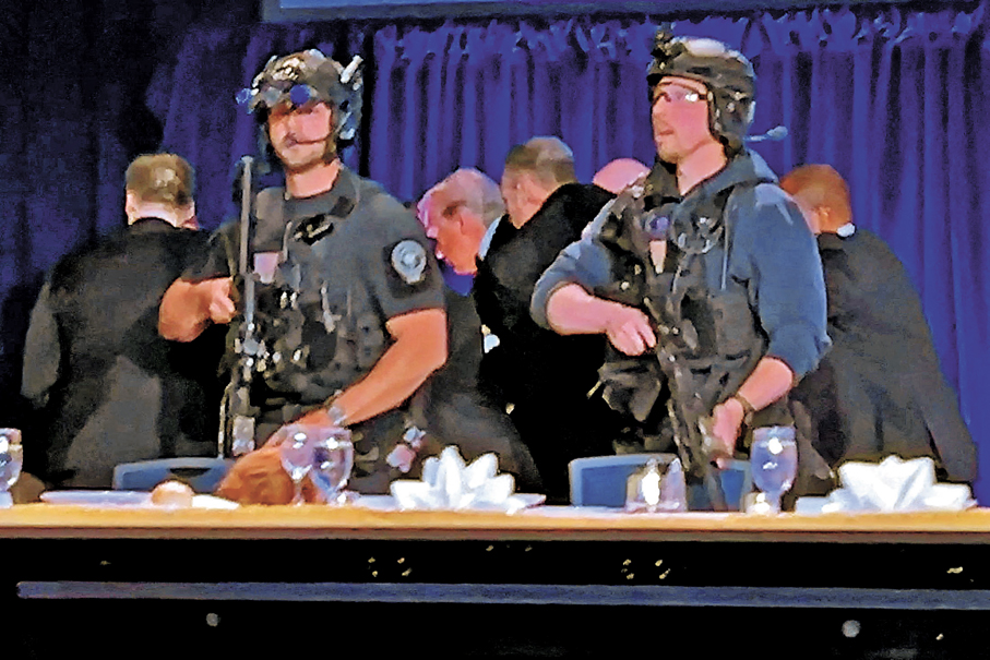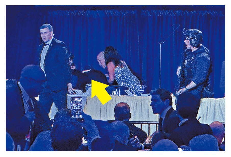 美媒報道,事發時正值晚宴開始僅5分鐘,現場突然傳出巨大聲響,引發混亂。當時特朗普與夫人梅拉尼婭坐在主席台上,正與美國魔術師派爾曼交談。突發的巨響驚動在場所有人,梅拉尼婭和派爾曼臉上均露出震驚表情,保安人員迅速上台,將特朗普和梅拉尼婭帶離主席台,期間特朗普一度摔倒,由多人扶起後護送離開。特勤局人員在旁拔槍戒備,現場不時傳出驚呼聲。