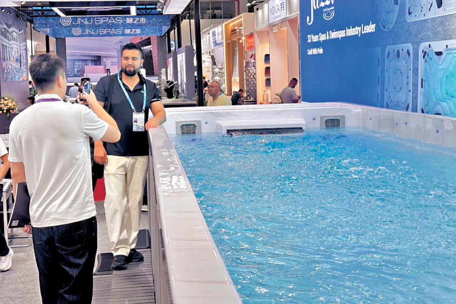 在衞浴設備展區,一款長達8.8米的大型家用「游泳池」成為本期廣交會上的熱門「打卡點」。廣東爵仕智造科技有限公司銷售總經理譚藝青介紹,公司做水處理起家,積累了技術優勢後轉向戶外游泳按摩缸領域,是國內最早的相關出口企業之一,目前產品遠銷全球,每月出口量可達400至600台,「這屆廣交會上每天都能訂出兩三台。」