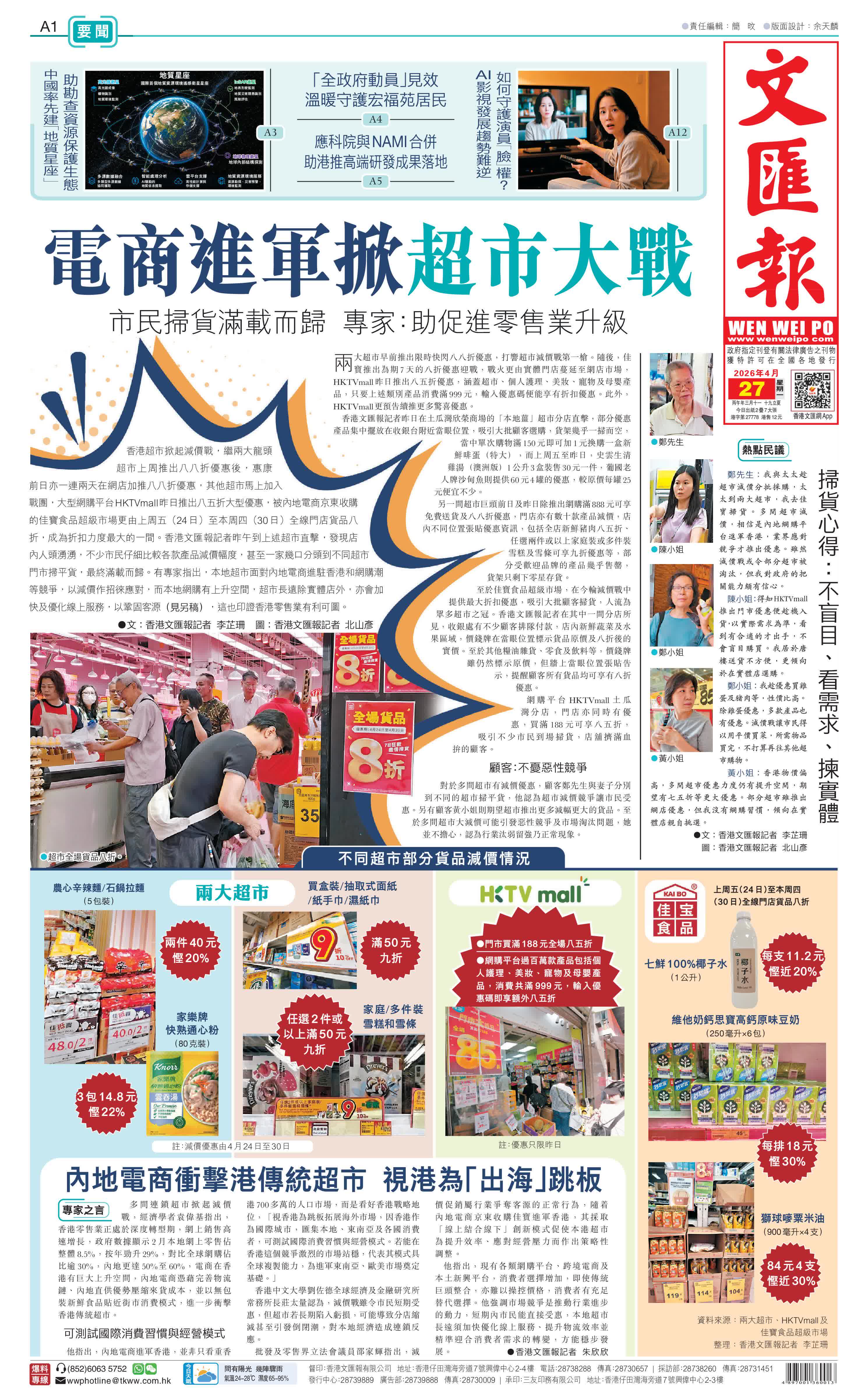 鄭先生:我與太太趁超市減價分批採購,太太到兩大超市,我去佳寶掃貨。多間超市減價,相信是內地網購平台進軍香港,業界應對競爭才推出優惠。雖然減價戰或令部分超市被淘汰,但我對政府的把關能力頗有信心。