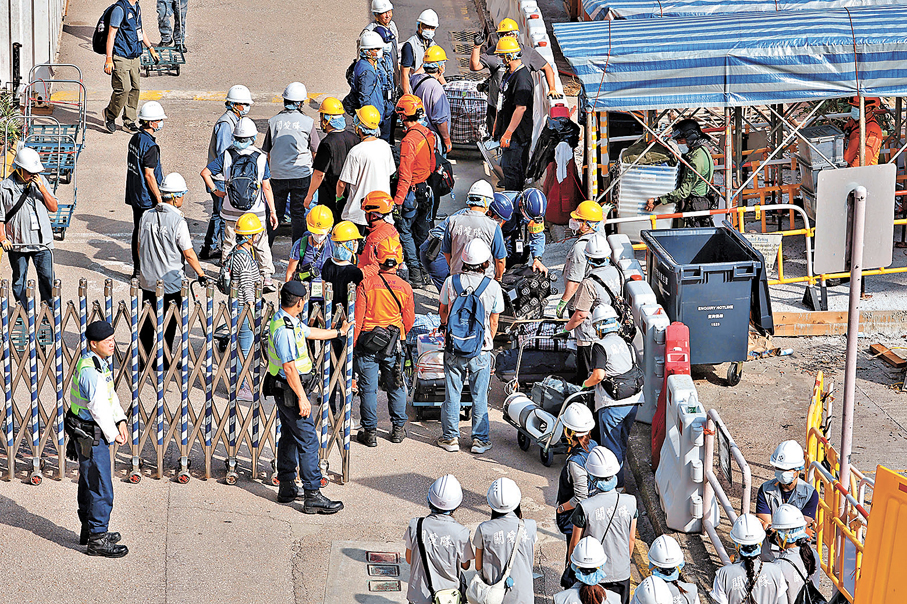 大埔宏福苑受大火影響的7座大廈居民,陸續獲安排上樓執拾,昨日輪到宏昌閣及宏道閣的居民獲安排上樓。香港文匯報記者昨日上午來到封鎖線外,即使只能遠眺出入口,但仍清楚看到各部門人員與義工如何無間協作、全力支援宏福苑居民。