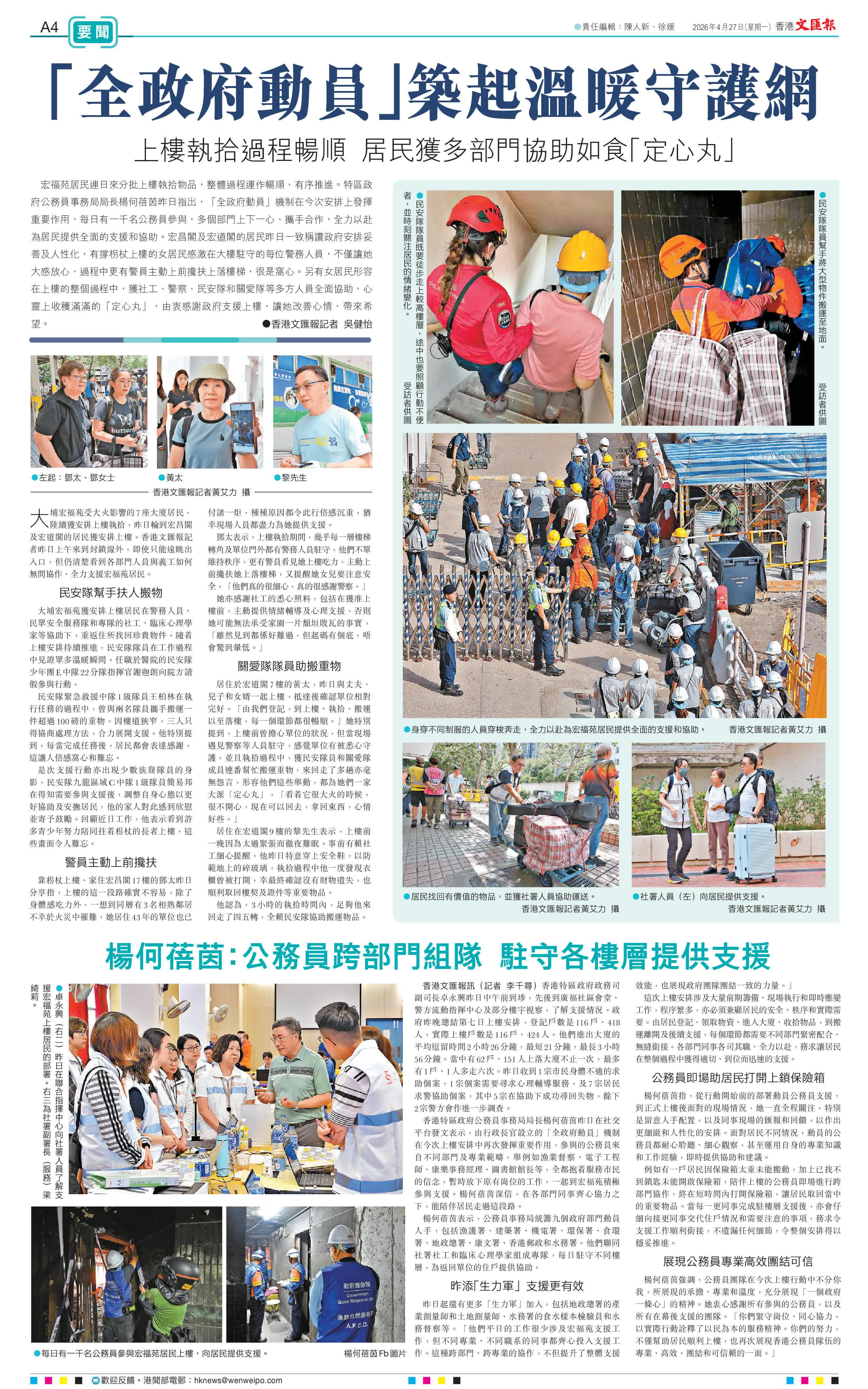 香港特區政府公務員事務局局長楊何蓓茵昨日在社交平台發文表示,由行政長官設立的「全政府動員」機制在今次上樓安排中再次發揮重要作用,參與的公務員來自不同部門及專業範疇,舉例如漁業督察、電子工程師、康樂事務經理、圖書館館長等,全都抱着服務市民的信念,暫時放下原有崗位的工作,一起到宏福苑積極參與支援。楊何蓓茵深信,在各部門同事齊心協力之下,能陪伴居民走過這段路。