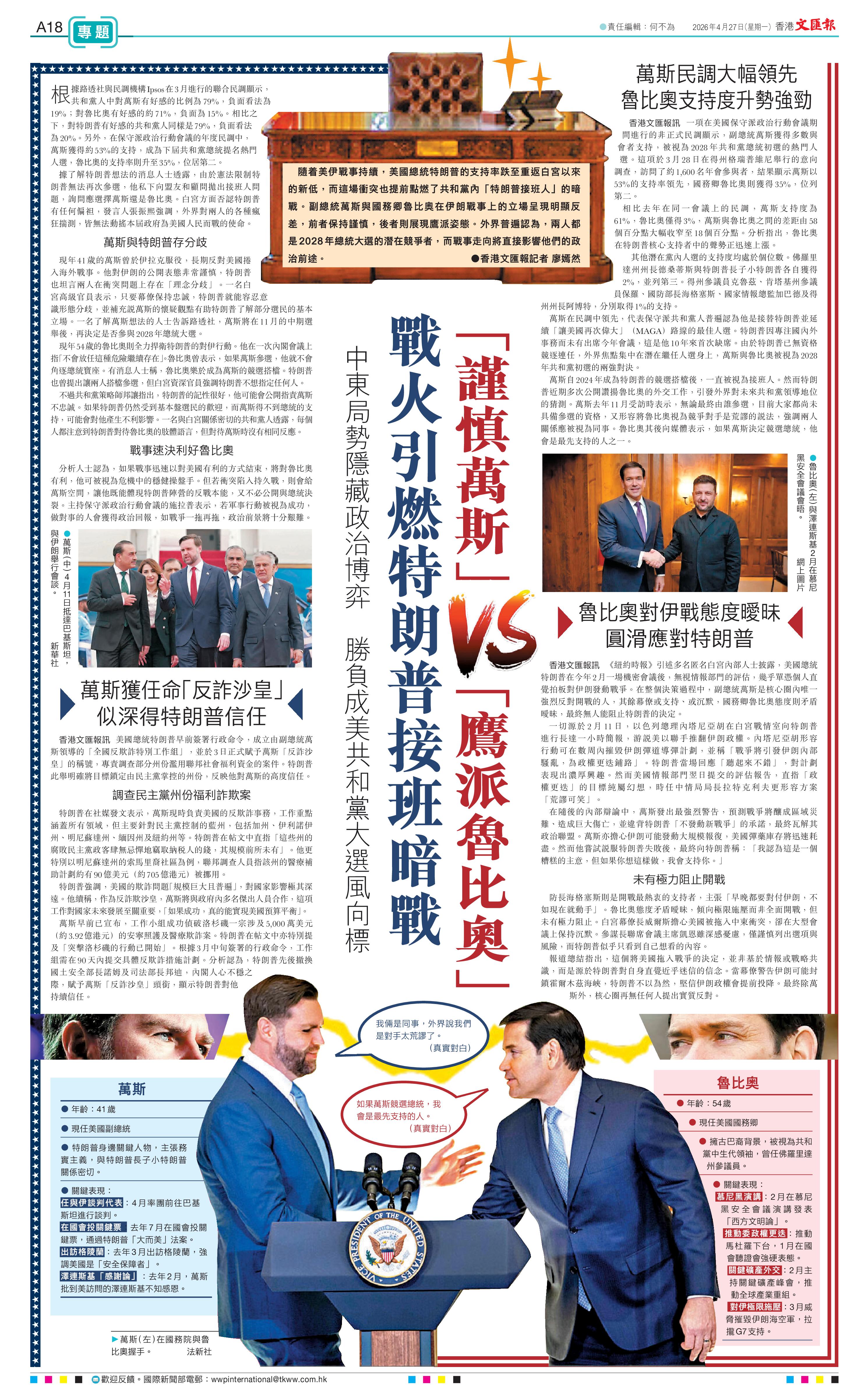 (香港文匯報記者 廖嫣然)隨着美伊戰事持續,美國總統特朗普的支持率跌至重返白宮以來的新低,而這場衝突也提前點燃了共和黨內「特朗普接班人」的暗戰。副總統萬斯與國務卿魯比奧在伊朗戰事上的立場呈現明顯反差,前者保持謹慎,後者則展現鷹派姿態。外界普遍認為,兩人都是2028年總統大選的潛在競爭者,而戰事走向將直接影響他們的政治前途。