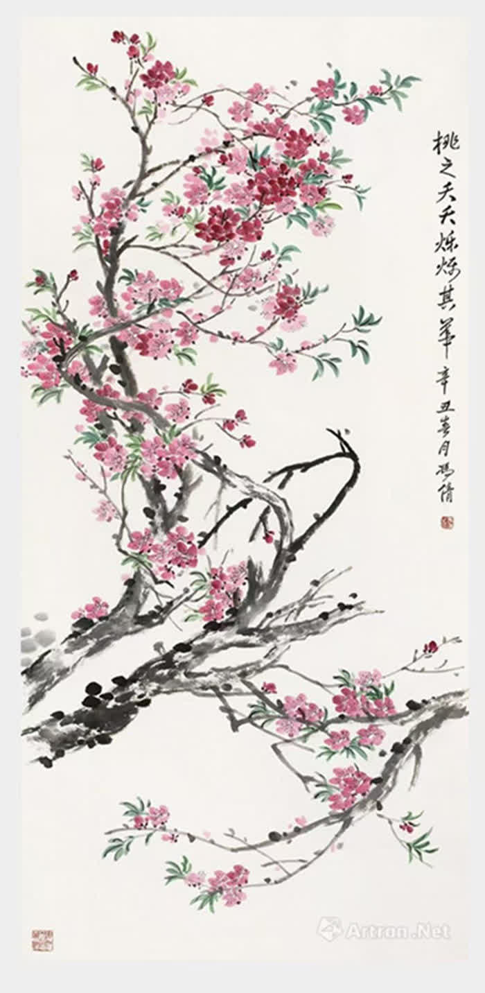 一幅是曾入選2025年中國國家畫院展覽的作品《桃之夭夭》,這幅作品凝聚了東方傳統的自然感悟。「明媚的陽春三月,我漫步在漫山遍野的桃花林中,陽光穿過嫣紅色的花瓣泛出雲霞般的光澤,微風拂過枝條搖曳生姿,劃出優雅的弧線,如雪花般飄飄灑灑的花瓣落滿地面。不禁想起詩經裏描寫桃花的詩句:桃之夭夭灼灼其華;桃之夭夭,其葉蓁蓁……」馮倩追述起創作心境時,舒眉展笑,「我感受着大自然的魅力,看着桃花的妖嬈嫵媚,心想何不用畫筆表現出這美好的瞬間,於是我用傳統的寫意筆法加現代的色彩形式感創作出了這幅《桃之夭夭》的作品。」