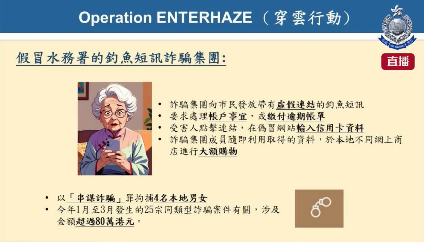 為打擊釣魚短訊詐騙,今年3月港島總區刑事部經過深入調查、整合及分析大量閉路電視片段,包括「銳眼」計劃安裝於罪案黑點的閉路電視,鎖定一個活躍本港詐騙集團位於觀塘一工廈單位的釣魚短訊發放中心,集團涉假冒水務署向市民發放帶有虛假連結的釣魚短訊,要求處理賬戶事宜或繳付逾期賬單;當受害人點擊連結在偽冒網站輸入信用卡資料後,詐騙集團成員隨即利用取得資料,於本地不同網上商店進行大額購物。警方行動中,以涉嫌「串謀詐騙」罪拘捕4名本地男女,初步與今年1月至3月共25宗同類型偽冒水務署、證券公司、零售商等釣魚短訊詐騙案件有關,涉案金額逾80萬港元。