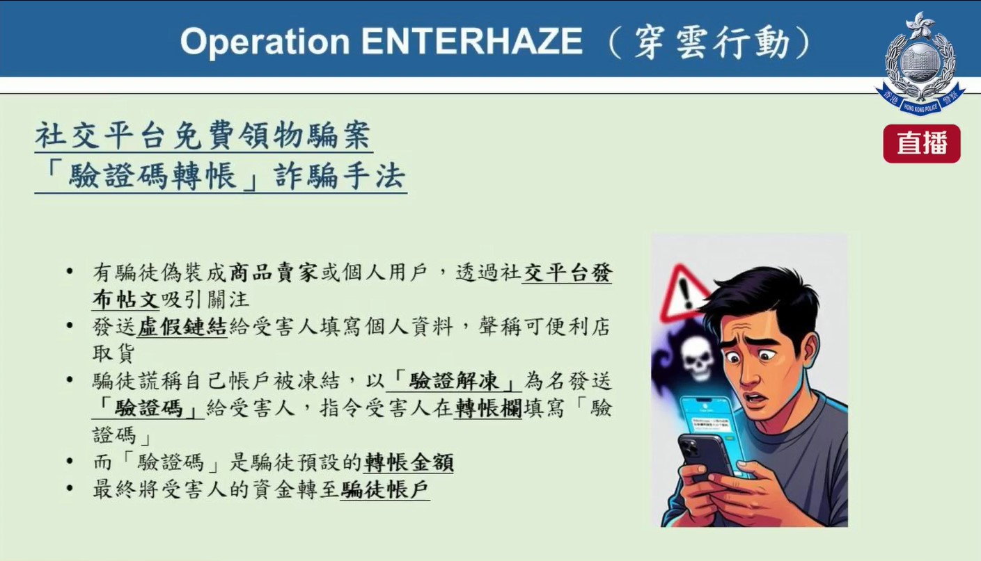 此外,警方近期注意到有騙徒偽裝成商品賣家或個人用戶,透過社交平台發文、或者發福利資訊,聲稱可免費領取二手物品或其他各類產品,只需支付小額郵費給騙徒即可送達。騙徒與市民達成「送貨共識」後,會發送虛假的「郵寄資料填寫鏈結」,聲稱市民填寫個人資料並繳交少量郵費後,便可到就近便利店取貨。但市民完成資料提交後,騙徒即編造藉口,例如自己銀行賬戶被凍結,需買家協助驗證才能支付郵費,發送所謂「驗證碼」,要求市民登錄個人網上理財賬戶,將該「驗證碼」填入轉賬欄以完成「解凍驗證」,事後才發現「驗證碼」即是轉賬金額,騙徒已經轉走資金及失聯。