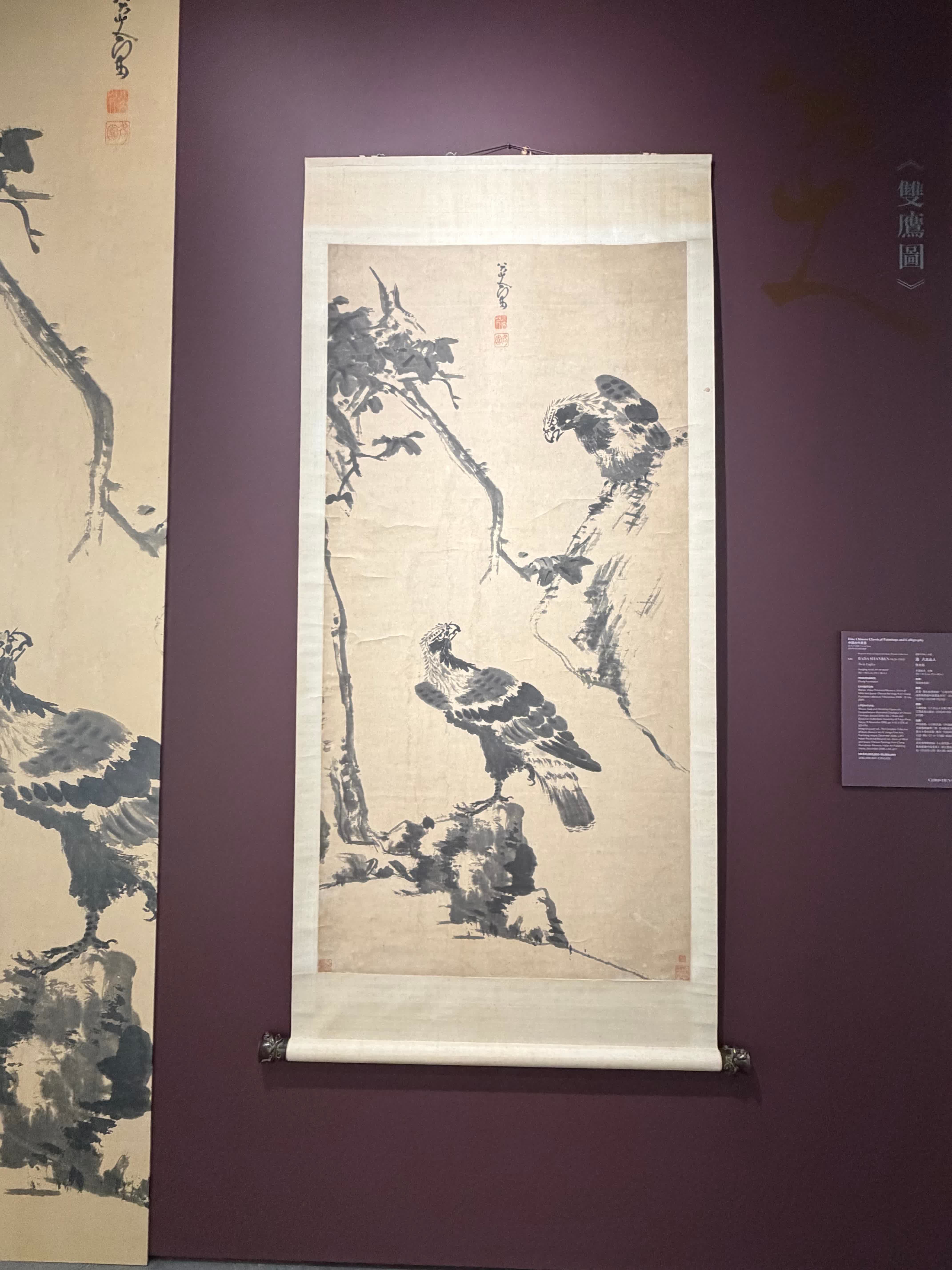 「這次呈現的八大山人《雙鷹圖》,是目前所知在江西八大山人紀念館、上海博物館、美大都會博物館以外的第四件作品,亦是目前市場唯一的《雙鷹圖》。款字的書寫結耩形狀,屬於他1694年以後標準晚年風格。」他指出,從傳世四幅八大的《雙鷹圖》來看,八大似乎更喜歡將鷹安置於石頭之上,本幅《雙鷹圖》,雙鷹立於高低雨塊石頭,樹枝向右斜下,作劃分或速接上下石塊的界線和橋樑,不作傳統「良禽擇木而」的想像,或許與八大喜好石頭冰冷嶙峋久遠的思維有關。