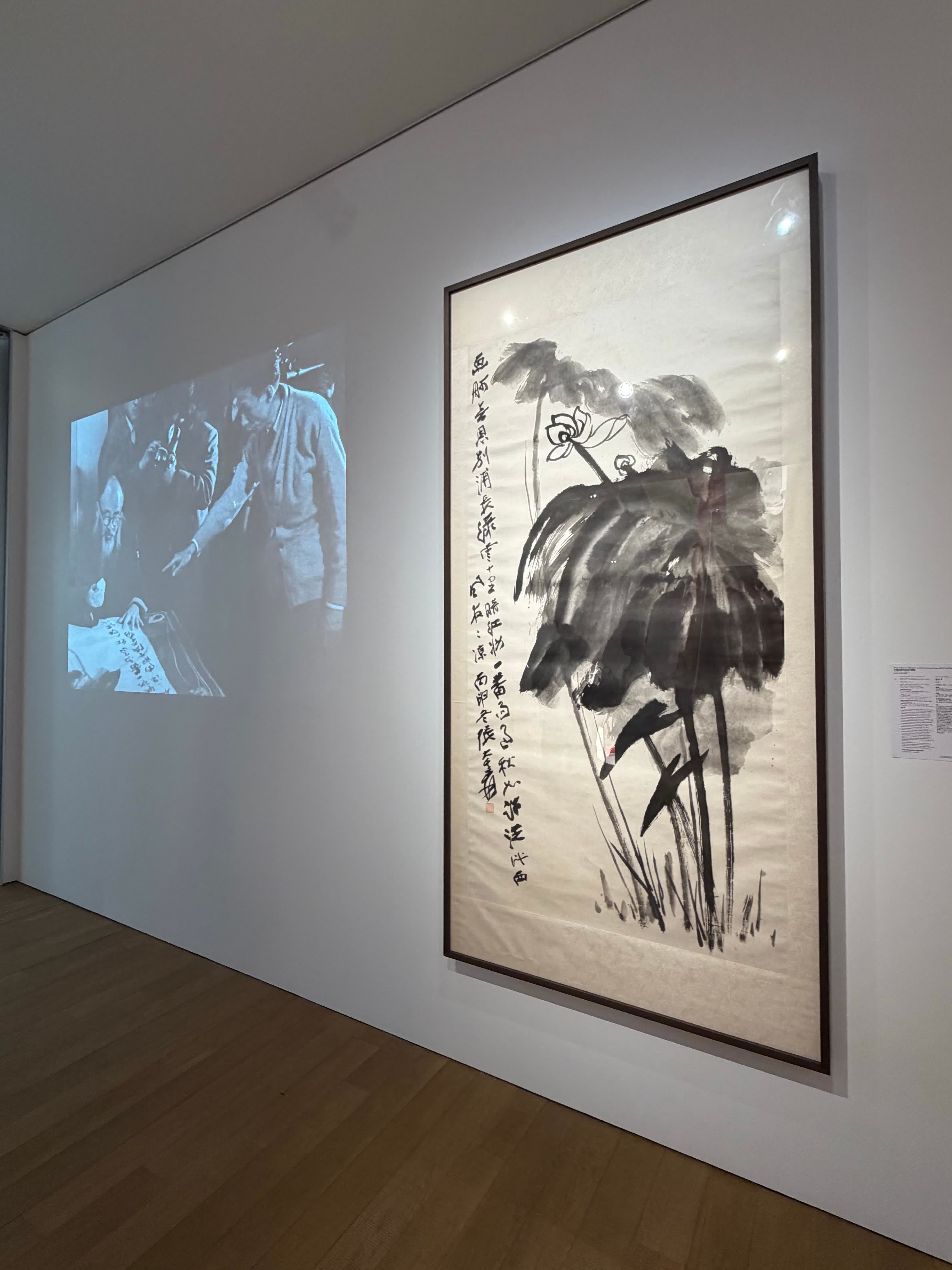 Andy介紹:「八大愛石,他筆下的魚、鳥、鹿等,常以石頭陪,動物的生命力、鮮活柔和,與石頭的冷硬沉寂和靈性,形成如大極險陽一般的對比。」同場現拍的另一件八大山人畫作《柱石圖》寫孤石, 是八大山人以物寫心的代表性圖式,「此件《柱石圖》的巨石沉厚穩重,估據畫面中間至右下,在他中鋒圓潤線條下,八大筆下石頭時常以筆表現瘦、皺特徵·鮮有透、漏,此畫石頭墨的染使得光影感更強·沉實穩重,具有石頭本質的恆久性和固性。」如果與《雙鷹圖》並觀,便八大晚年筆墨的高度凝練、遺民身份和文人理想的交錯。
