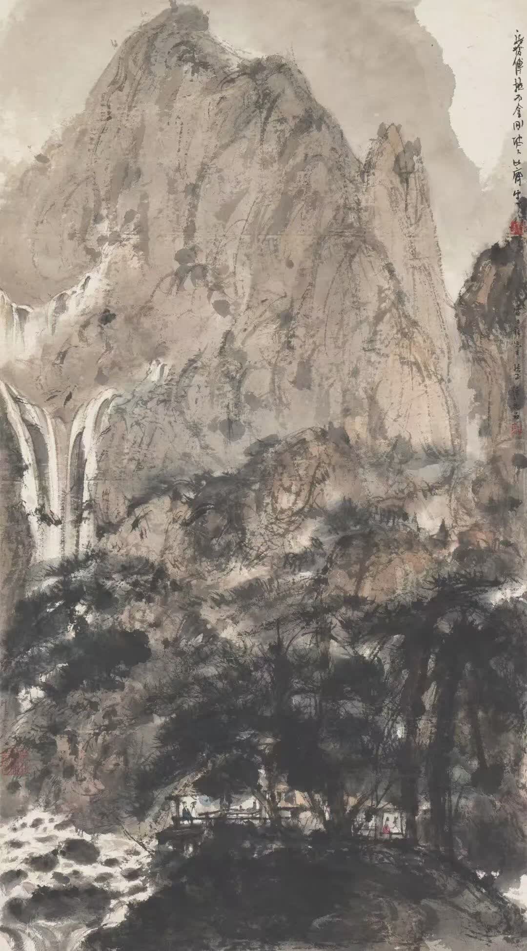 他續分析,該作極少留白之處,畫面佈局頗有北宋巨碑式山水的壓迫感,「畫家以肆意徜徉之線條描繪遠景中草木蔥鬱山峰主體,佔據畫面上部,此部以典型的抱石皴寫就,氣勢取勝,不拘細節。由畫面左側飛瀑聯繫至畫面下方,山腳處陡然一變,生機萬千。幾株古樹蔥蔥鬱郁,遮天蔽日,樹蔭下亭台茅屋隱現。偌大樹冠下,見幾位高士對談,亭下書籍及茶具若現。雖此部分身處畫面最底,但畫家施以明亮色彩,儼然成為整幅作品視覺上的中心與亮點。傅抱石構圖力求嚴謹,處處做到有所呼應,山峰與山腳,天工與造物,自然與人文,虛與實,均有所對應,由此達成一種無所拘束,又縝密經營的境界,足顯畫家之技巧與功力。」