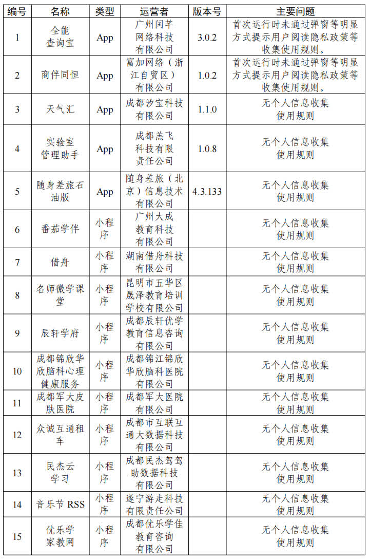 一、全能查詢寶、商伴同恒等15款App無個人信息收集使用規則或在首次運行時未通過彈窗等明顯方式提示用戶閱讀個人信息收集使用規則(詳見下表)。