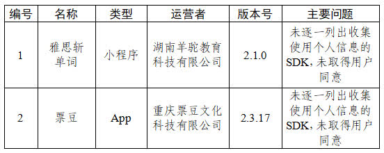 二、雅思斬單詞、票豆等2款App未逐一列出收集使用個人信息的SDK,未取得用戶同意(詳見下表)。