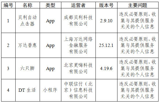三、貝利自動點擊器、萬達普惠等4款App違反必要原則,收集與其提供的服務無關的個人信息(詳見下表)。