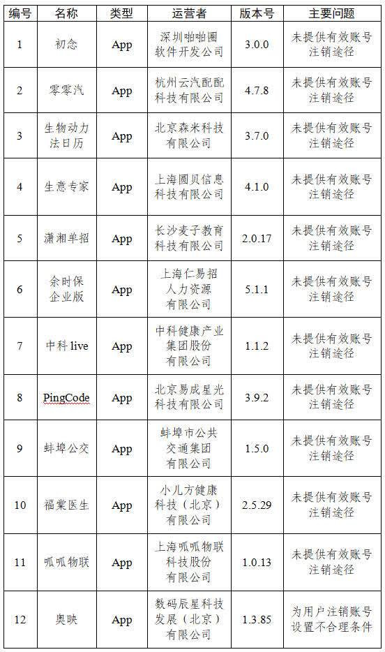 四、初念、零零汽等12款App未提供有效賬號註銷途徑或為用戶註銷賬號設置不合理條件(詳見下表)。