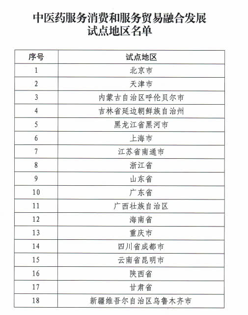 貫徹落實黨中央、國務院關於創新提升服務貿易、推動服務消費高質量發展、促進中醫藥傳承創新發展的部署要求,商務部、中央宣傳部、文化和旅遊部、市場監管總局、體育總局、國家中醫藥局正組織開展「源自中國、澤被世界:中醫藥服務消費和服務貿易融合發展試點」工作,確定18個地區為中醫藥服務消費和服務貿易融合發展試點地區。