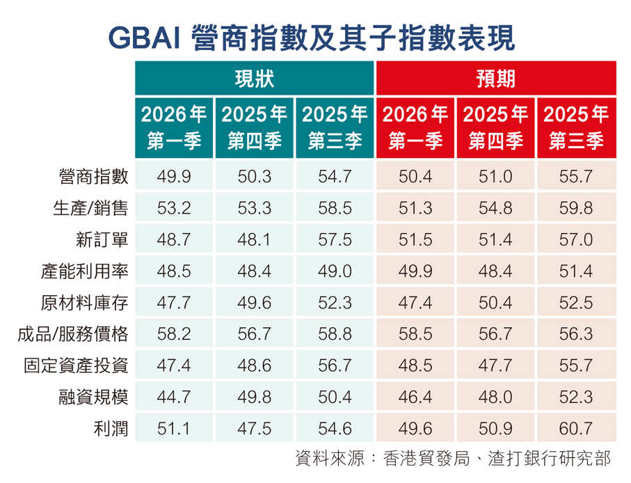 香港文匯報訊(記者 陳鍵行)中東局勢仍未明朗之下,渣打銀行與香港貿發局昨日聯合公布最新的渣打大灣區營商景氣指數(GBAI)顯示,儘管受油價急升和中東衝突影響,大灣區的內需表現逆市上升,令大灣區企業第一季營商信心仍與上一季持平,第一季營商活動的「現狀」指數由去年第四季的50.3微跌至49.9,「預期」指數則由51下跌至50.4,「現狀」及「預期」指數仍處50榮枯線上下,顯示營商情緒仍然保持穩定。