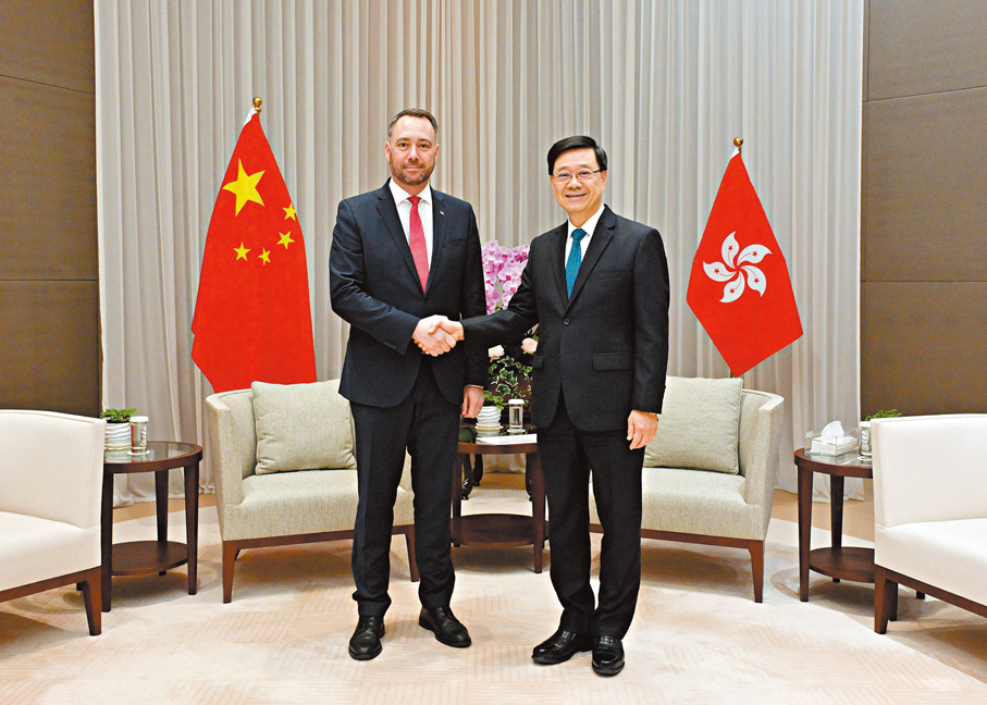 香港文匯報訊 香港特區行政長官李家超昨日與比利時副首相兼外交大臣普雷沃會面,就深化香港和比利時合作交流意見。香港特區政府署理財經事務及庫務局局長陳浩濂亦有出席。李家超歡迎普雷沃率團訪港,並指比利時是香港在歐盟的主要貿易夥伴之一,多家比利時企業在香港設立業務據點,今年適逢比利時駐港總領事館成立100周年,體現兩地往來、合作頻繁。香港作為國際貿易中心,在最自由經濟體排名穩居世界第一,是全球第五大商品貿易經濟體。他有信心雙方會在經貿投資、創新科技和人文交流等領域進一步加強合作,開創更廣闊的合作空間。