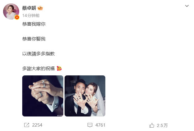 28日,蔡卓妍(阿Sa)在社交平台官宣結婚,並配文「恭喜我嫁你,恭喜你娶我,以後請多多指教,多謝大家的祝福!」