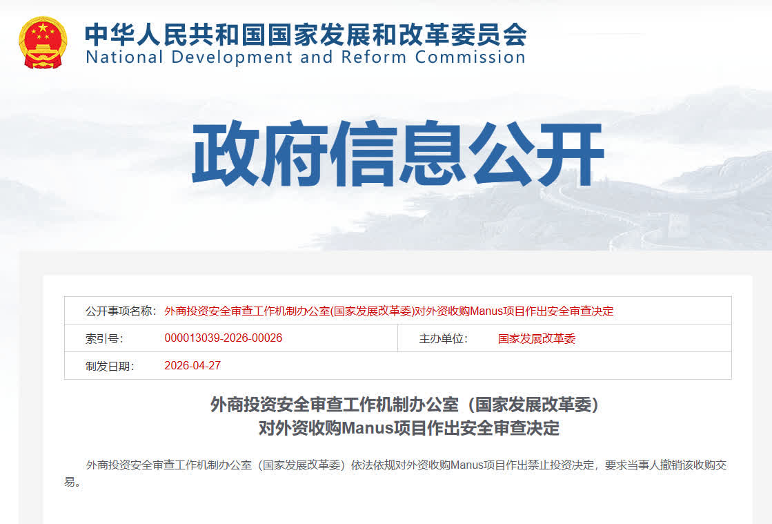 據央視新聞報道,4月27日,備受各方關注的Manus併購案靴子落地,中國外商投資安全審查工作機制辦公室(國家發展改革委)依法依規對外資收購Manus項目作出禁止投資決定,要求當事人撤銷該收購交易。