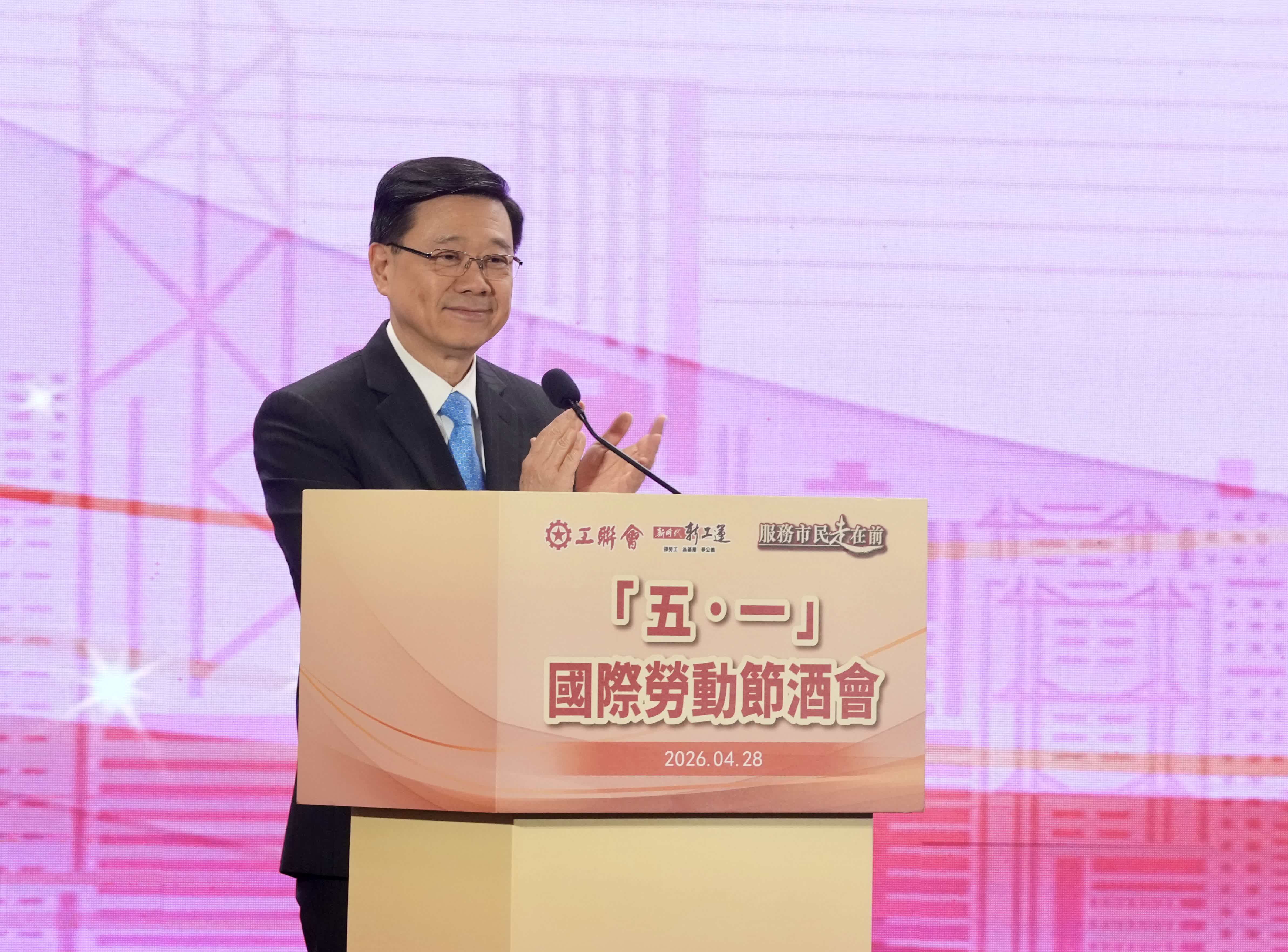 行政長官李家超今日(4月28日)出席香港工會聯合會慶祝「五.一」國際勞動節酒會表示,五一國際勞動節是每一位勞工的重要日子,是社會對勞工工作的肯定和予以感謝的日子。他首先向香港每一位打工仔女講聲:辛苦曬!你們日復日的付出和汗水,既撐起自己的家庭,更為香港社會和經濟發展打好基礎,多謝你們!預祝各位勞動節快樂!
